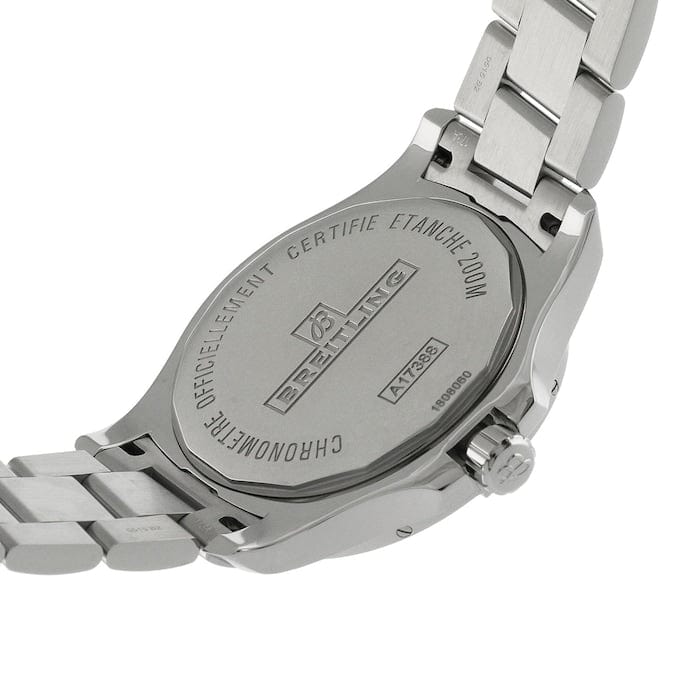 A brand new stainless steel chronometer certified automatic 44mm case size gentlemans Breitling Colt Automatic (A1738811.C906) featuring a blue baton dial h a date aperture at 3 O'clock and a red pointed seconds hand surrounded by a satin finish stainless steel 60 minute uni-directional bezel. This particular watch comes on a stainless steel Breitling Professional III bracelet.