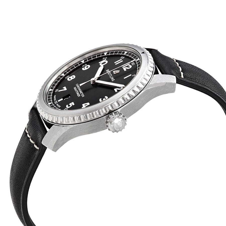Breitling Navitimer 8 Automatic 41mm watch. Model reference: A17314101B1X1. The iconic timepiece is a combination of watchmaking craftsmanship and a stylish design created to meet the need of professional pilots. Its rounded 41mm case of 10.74mm thickness is made of polished stainless steel and features a bidirectional rotating bezel. The black dial has a white painted scale, applied Arabic Numerals, and sword-shaped hands with luminous fill for hour and minute marking. The central hand serves for seconds tracking. The date window is placed at the 6 o’clock. The mechanical self-winding B17 movement features 25 jewels and a 40-hour power reserve. The strap is made of black calfskin leather and fitted with a tang buckle. It is water resistant up to 100m. Watch comes in original packaging, with a set of documents and 2 years warranty.