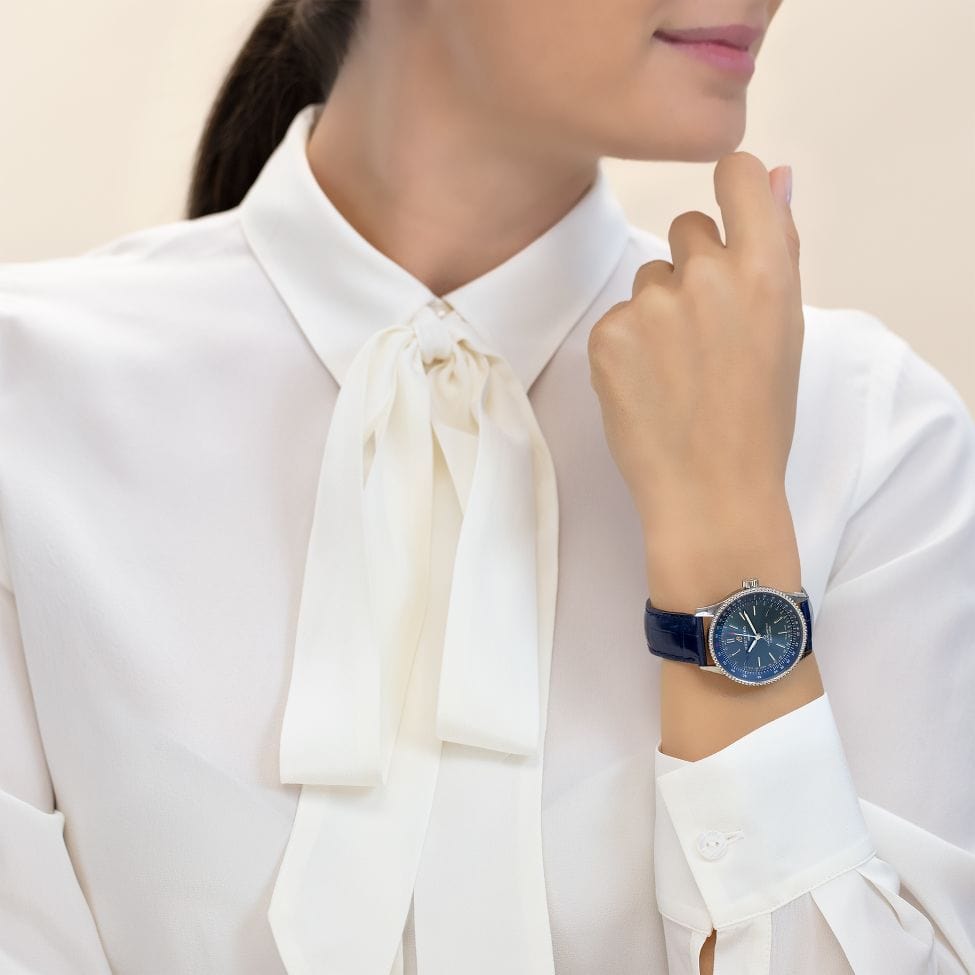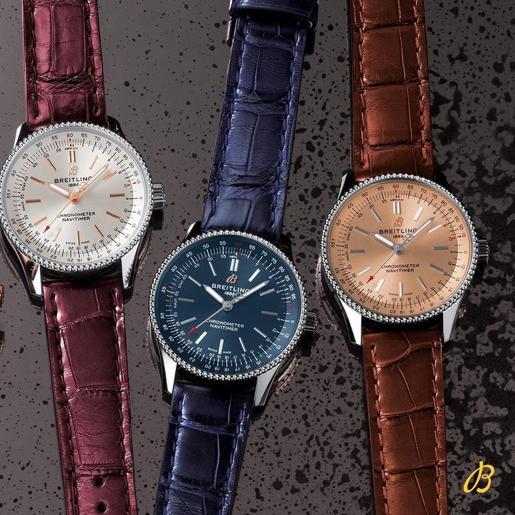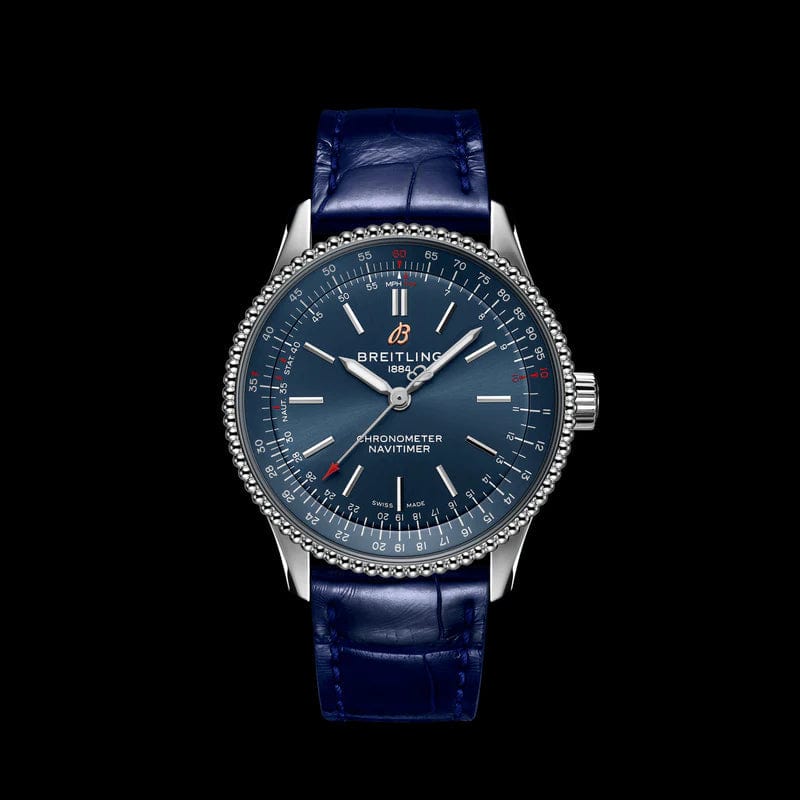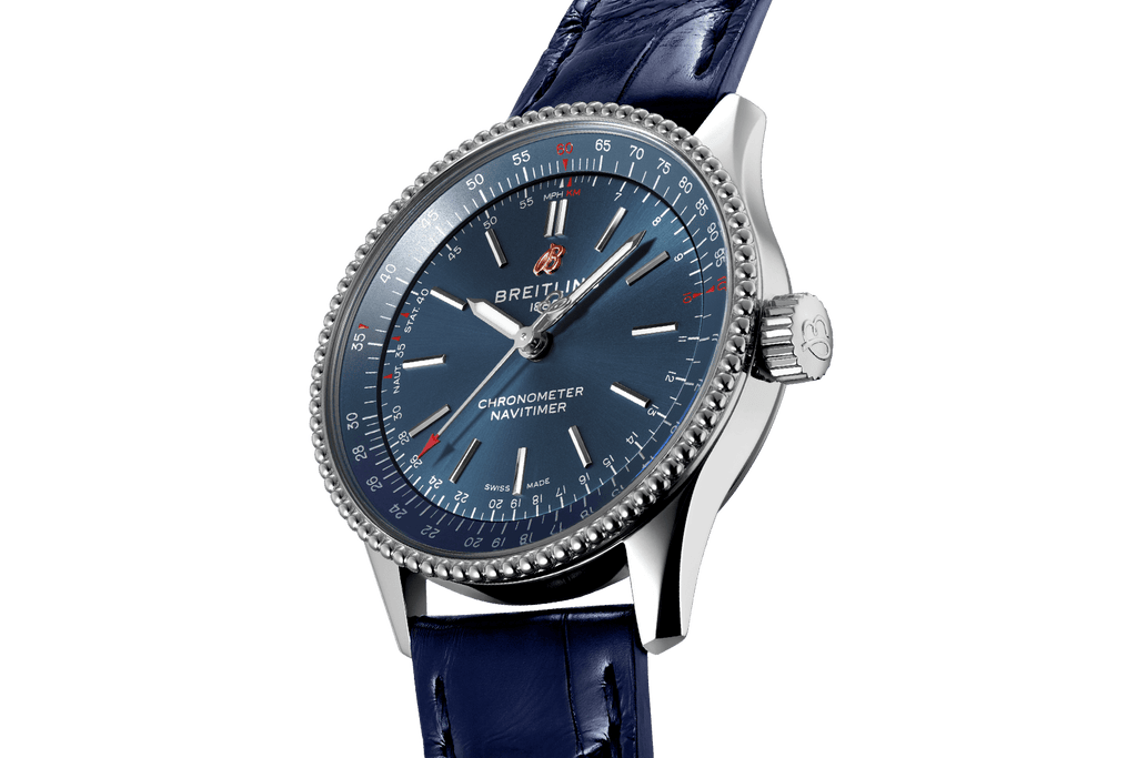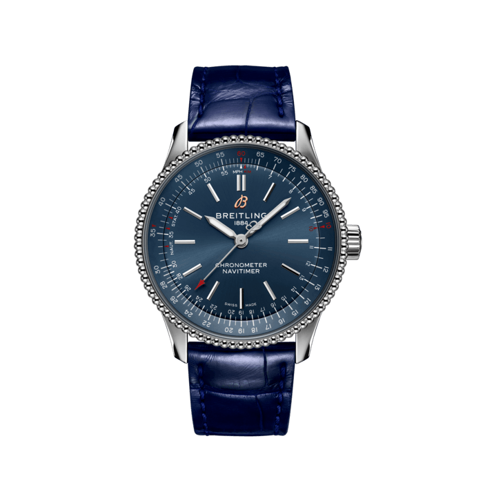 Refined and elegant, the Navitimer Automatic 35 combines the historic appeal of a true icon with the sophistication of a contemporary timepiece. Available in a variety of materials including stainless steel and 18k red gold, the 35 mm case features a beaded bezel and a range of elegant dial colors, as well as diamond-set white mother of pearl. Offered either with a matching bracelet or alligator strap that fits both a stainless steel pin or folding buckle, the Navitimer Automatic 35 is powered by the Breitling Caliber 17, a COSC-certified chronometer.