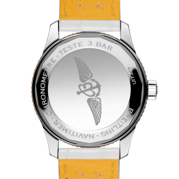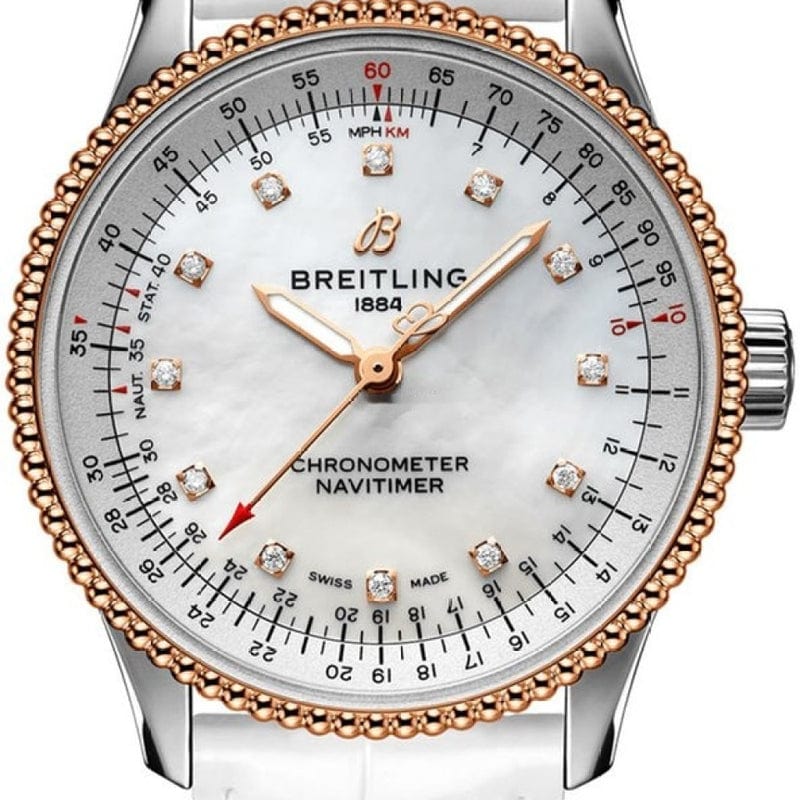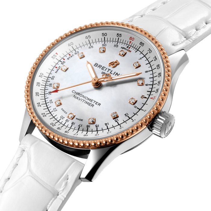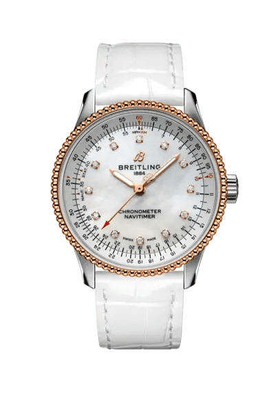 Refined and elegant, the Navitimer Automatic 35 combines the historic appeal of a true icon with the sophistication of a contemporary timepiece. Available in a variety of materials including stainless steel and 18k red gold, the 35 mm case features a beaded bezel and a range of elegant dial colors, as well as diamond-set white mother of pearl. Offered either with a matching bracelet or alligator strap that fits both a stainless steel pin or folding buckle, the Navitimer Automatic 35 is powered by the Breitling Caliber 17, a COSC-certified chronometer.