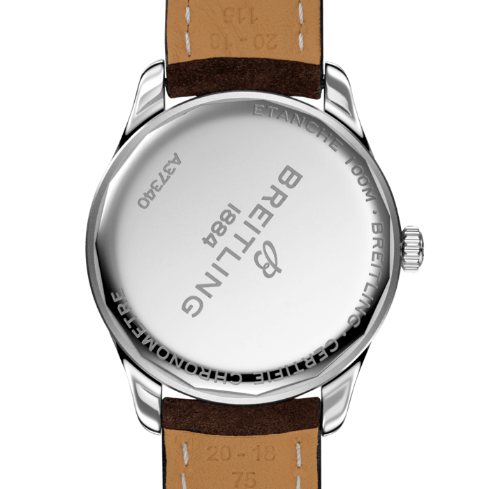 Stainless steel case with a brown (nubuck) leather strap. Fixed stainless steel bezel. Anthracite dial with luminous silver-tone hands and index hour markers. Minute markers around the outer rim. Dial Type: Analog. Luminescent hands and markers. Small second sub-dial. Breitling calibre 37 automatic movement, based upon ETA 2895-2, containing 27 Jewels, bitting at 28800 vph, and has a power reserve of approximately 42 hours. Scratch resistant sapphire crystal. Screw down crown. Solid case back. Round case shape. Case size: 40 mm. Case thickness: 11.40 mm. Band width: 20 mm / 18 mm. Tang clasp. Water resistant at 100 meters / 330 feet. Functions: hour, minute, second. Luxury watch style. Watch label: Swiss Made. Breitling Premier Automatic Anthracite Dial Men's Watch A37340351B1X1.