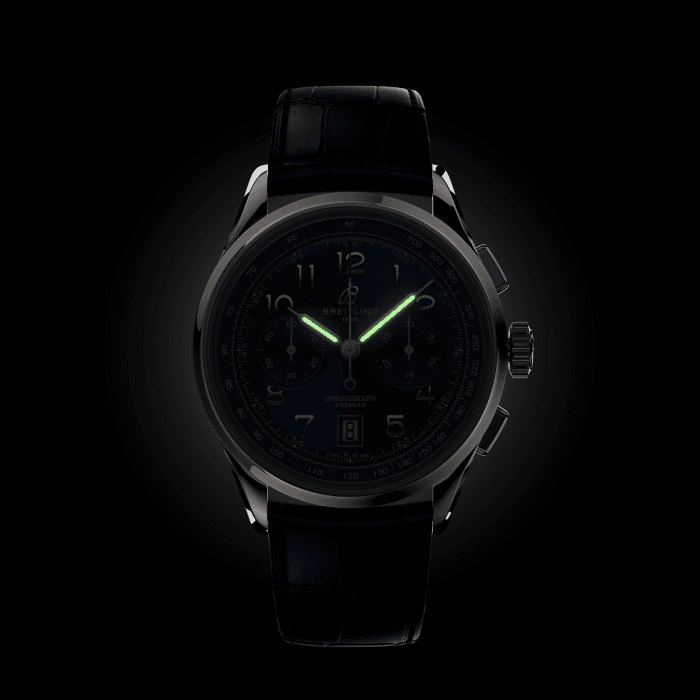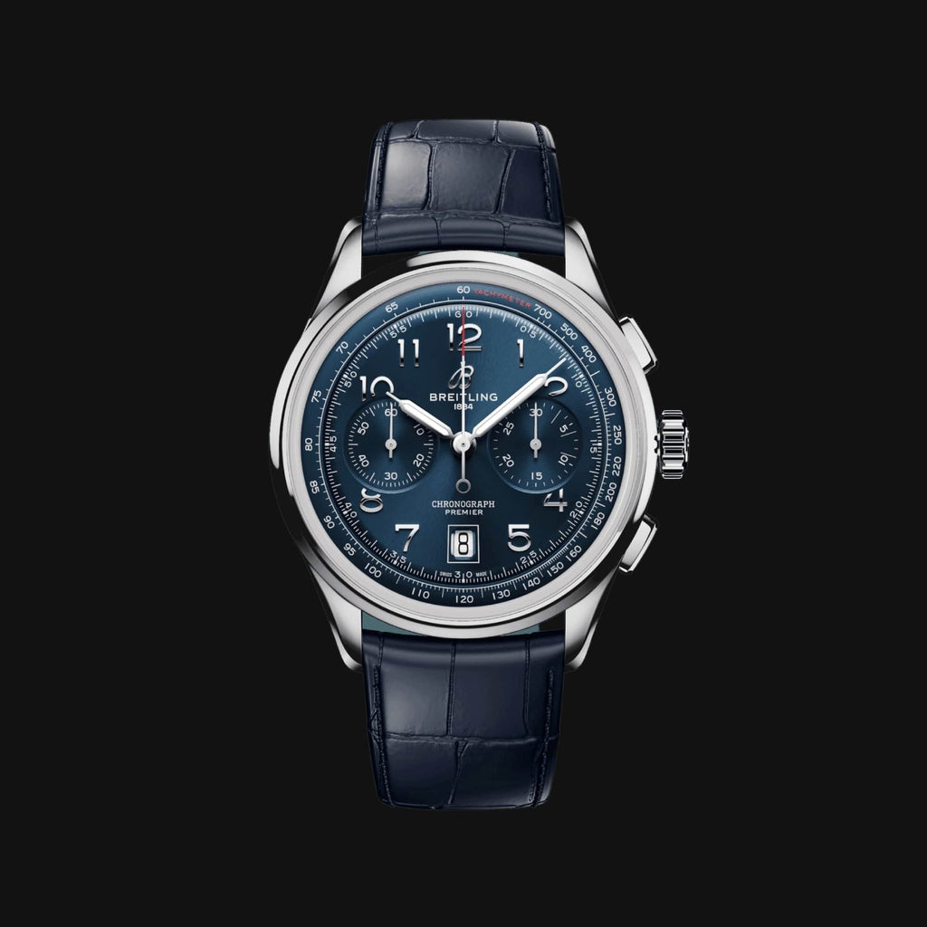 The Premier B01 Chronograph 42 is available in an array of dial colors and case materials. It comes on a choice of classic alligator leather strap or sleek 7-row metal bracelet. Today’s Premier also lives up to Willy Breitling’s uncompromising technical standards with its exceptional self-winding movement—the COSC-certified Breitling Manufacture Caliber 01—designed for maximum precision, reliability and functionality.