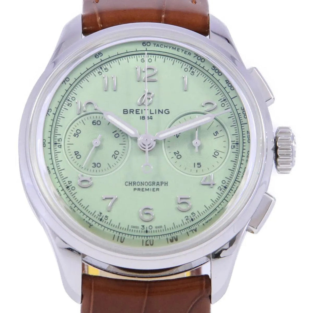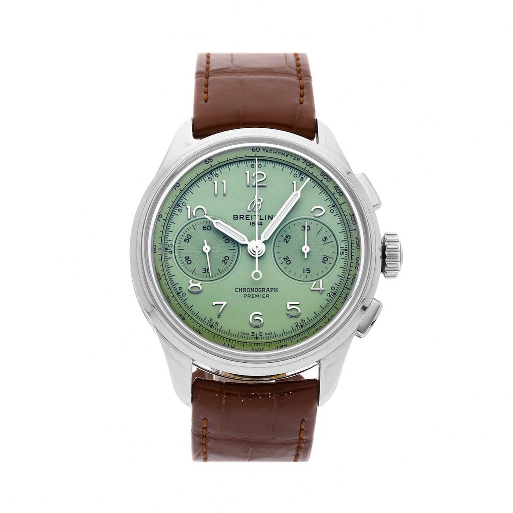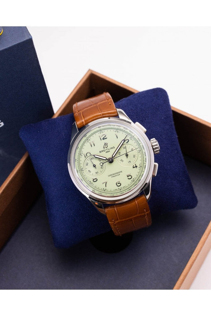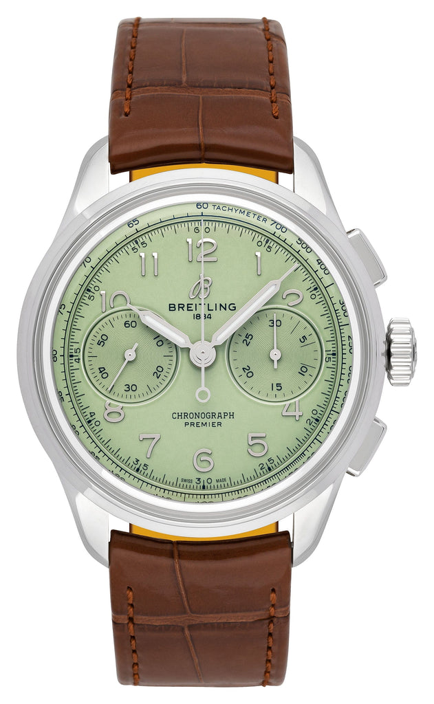 Featuring rectangular chronograph pushers, bi-compax chronograph look and Arabic numerals, the heritage-revived Premier chronographs display a variety of elegant design details such as grooves on the case-sides, open sapphire casebacks and vintage-inspired hands. The Chronograph comes in two variations: in stainless steel with a pistachio green dial and a gold brown alligator strap or in 18k red gold with a silver dial and a brown alligator strap. The Chronograph is powered by the manually wound cosc-certified Breitling Manufacture Caliber B09.