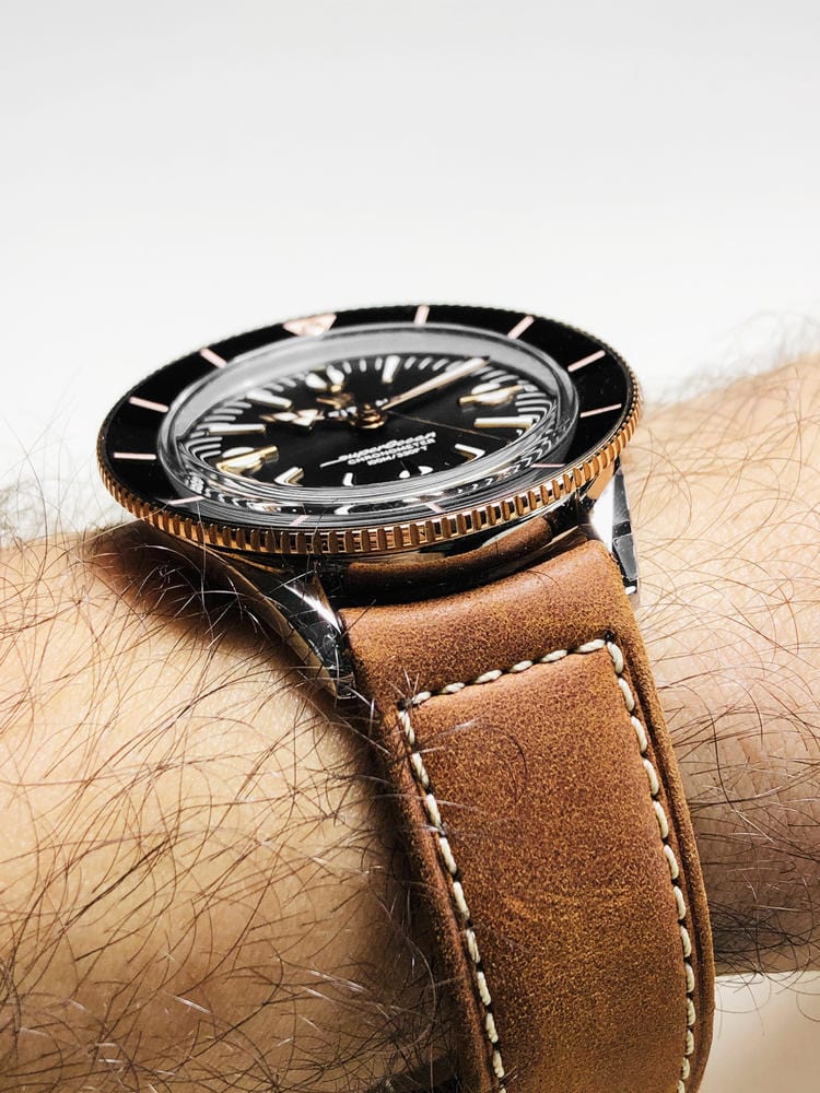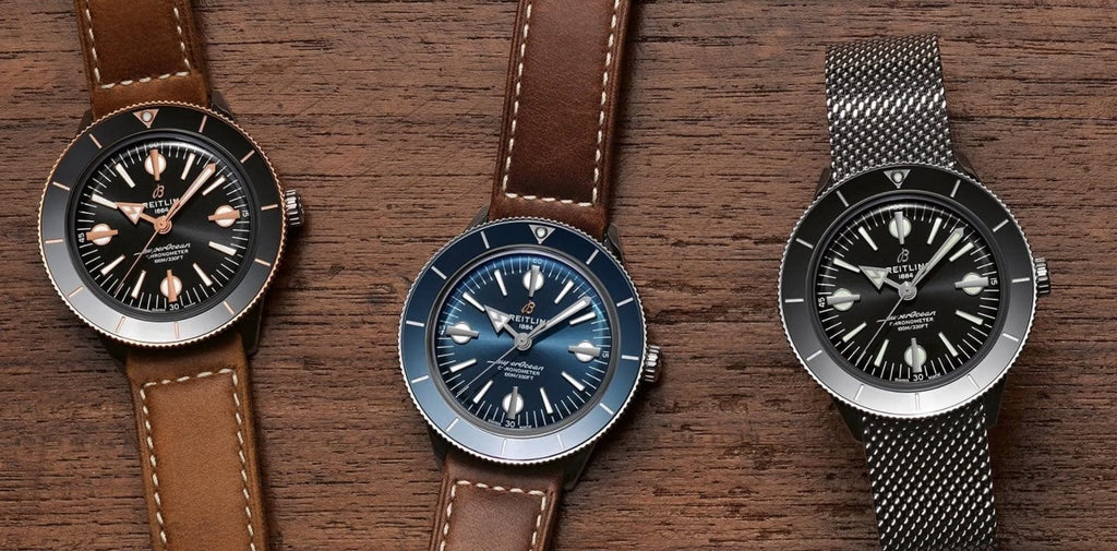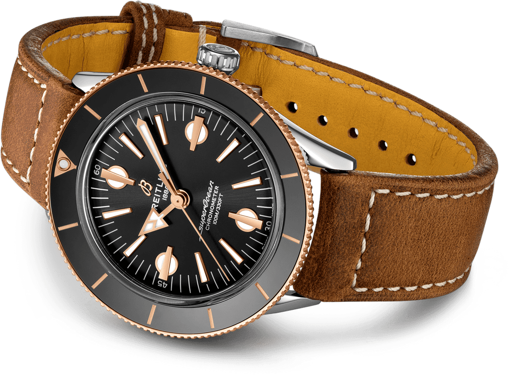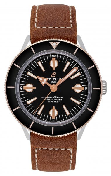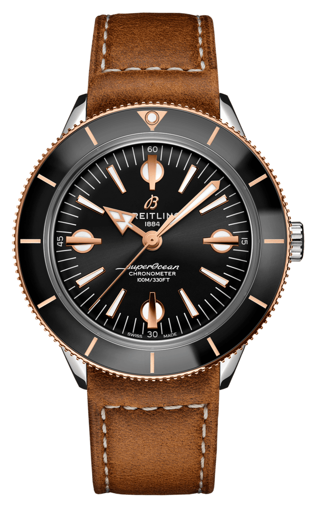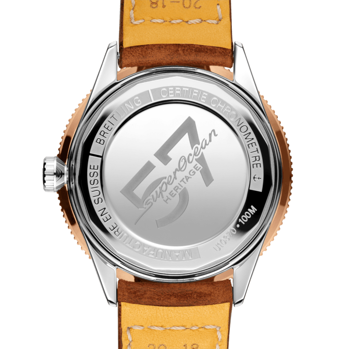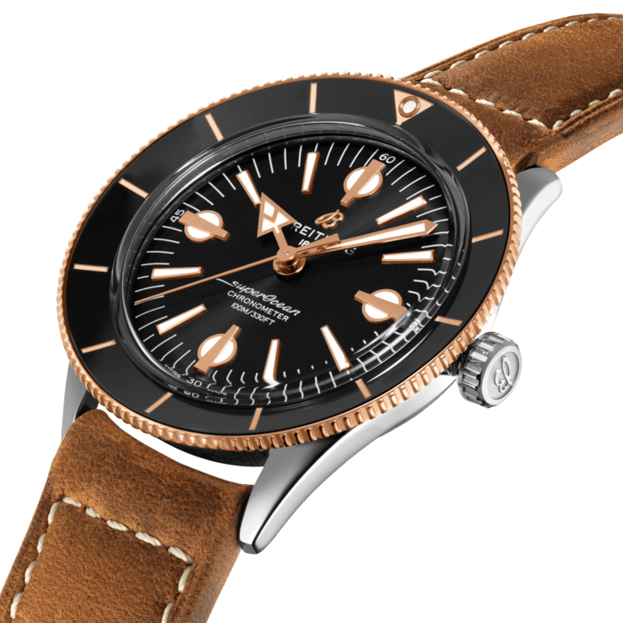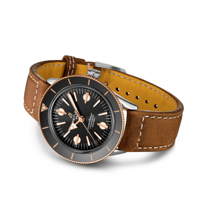 Paired with a mesh bracelet or a black, brown or gold calfskin leather strap that fits both a stainless-steel pin or folding buckle, the Superocean Heritage ‘57 is powered by the Breitling Caliber 10, a COSC-certified chronometer.