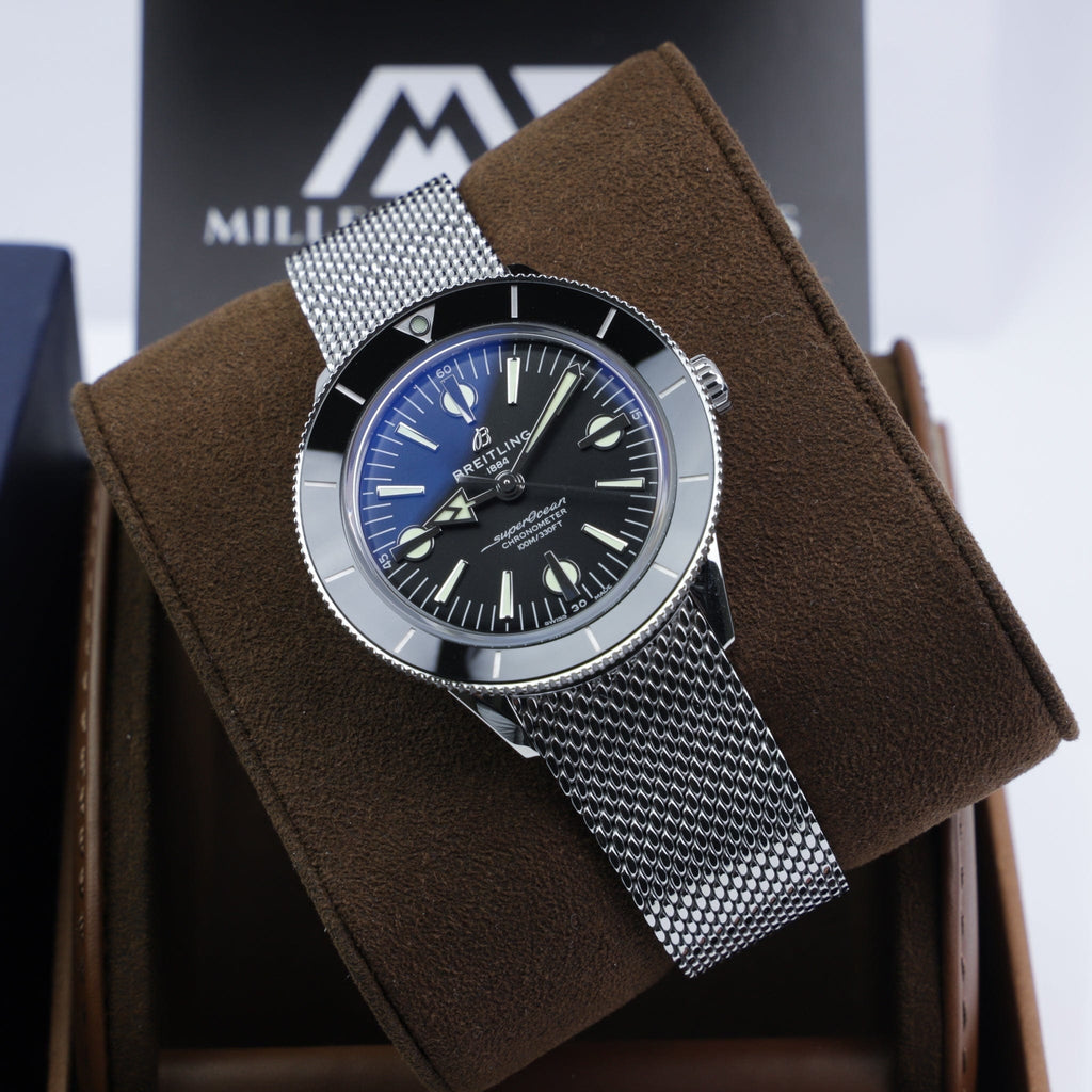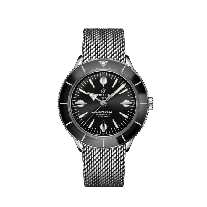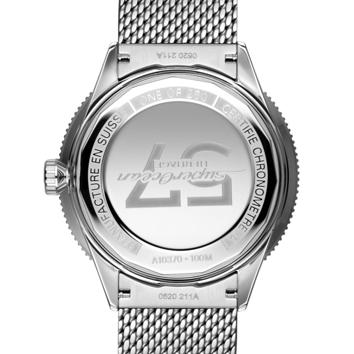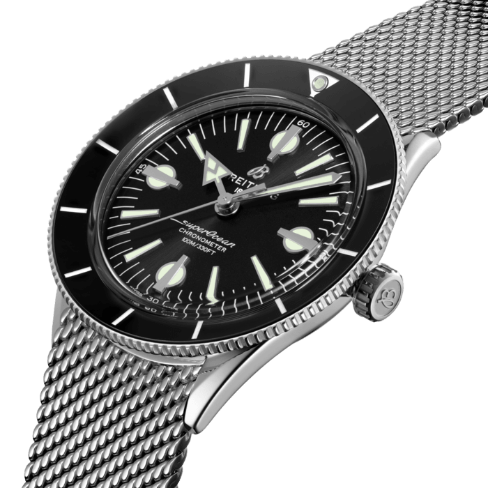 Paired with a mesh bracelet or a black, brown or gold calfskin leather strap that fits both a stainless-steel pin or folding buckle, the Superocean Heritage ‘57 is powered by the Breitling Caliber 10, a COSC-certified chronometer.