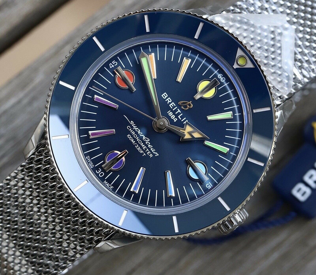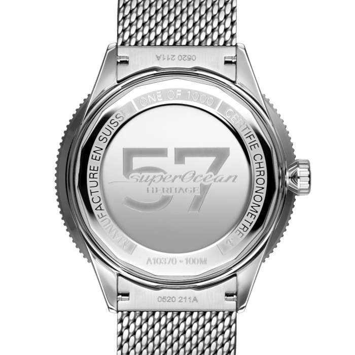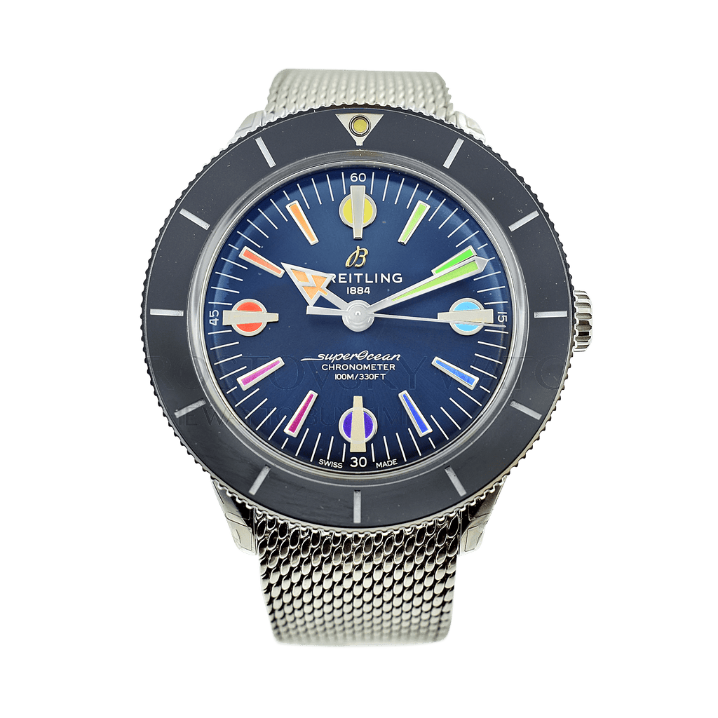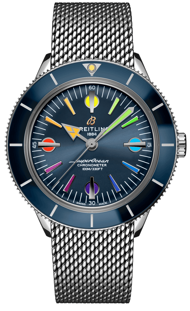 Paired with a mesh bracelet or a gold brown calfskin leather strap that fits both a stainless-steel pin or folding buckle, this colorful Superocean Heritage ‘57 is powered by the Breitling Caliber 10, a COSC-certified chronometer.