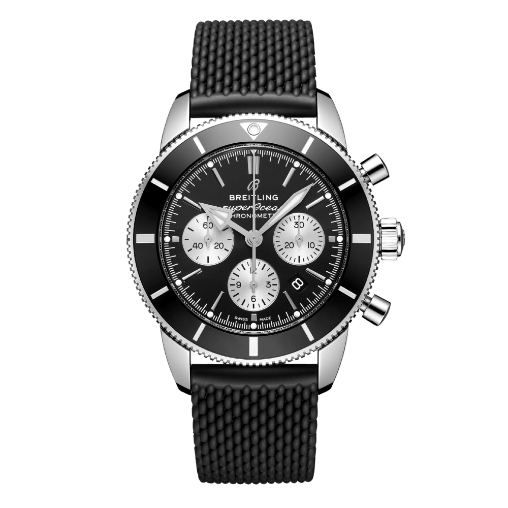 Available in a variety of materials including stainless steel and 18k red gold, the Superocean Heritage B01 Chronograph 44 features a range of black, blue, silver, or green dials. Offered either with a matching mesh bracelet, or a “mesh-styled” rubber strap fitting a folding buckle, this Superocean Heritage is powered by the in-house Breitling Manufacture Caliber 01, a COSC-certified chronometer.