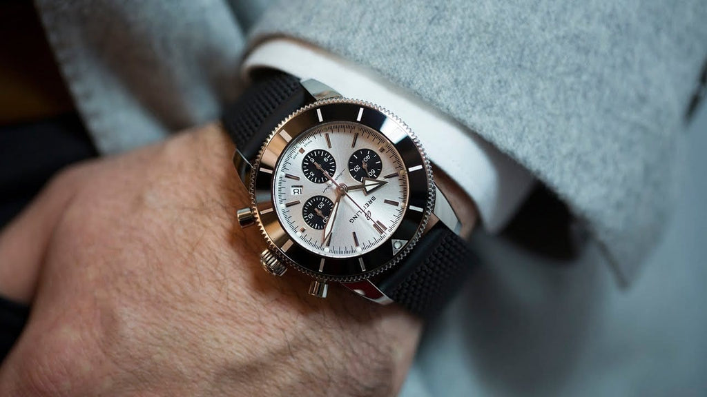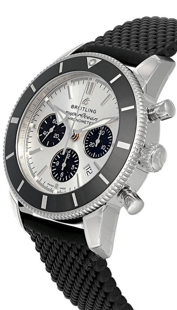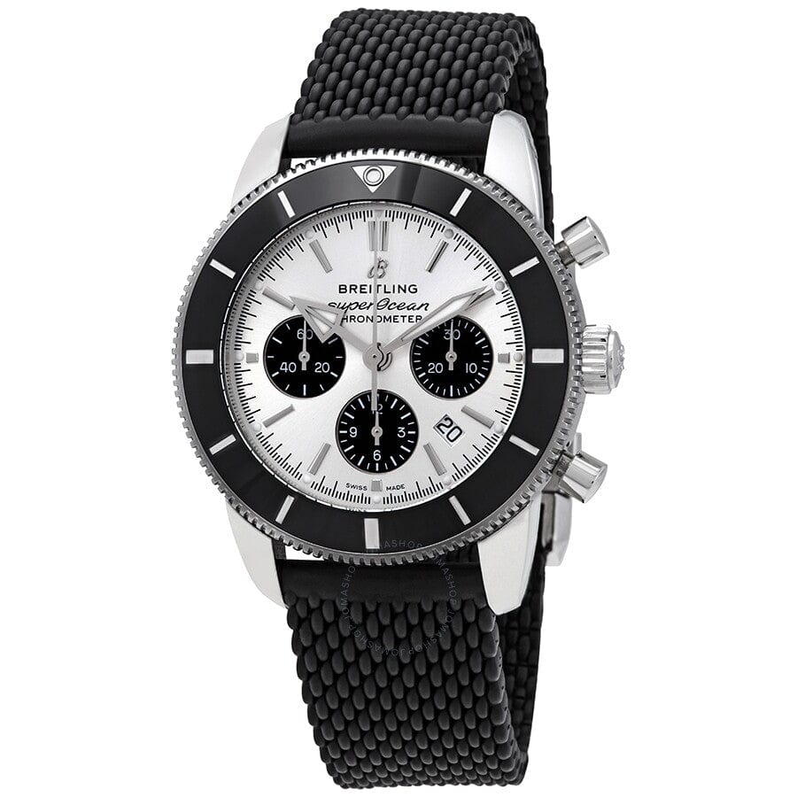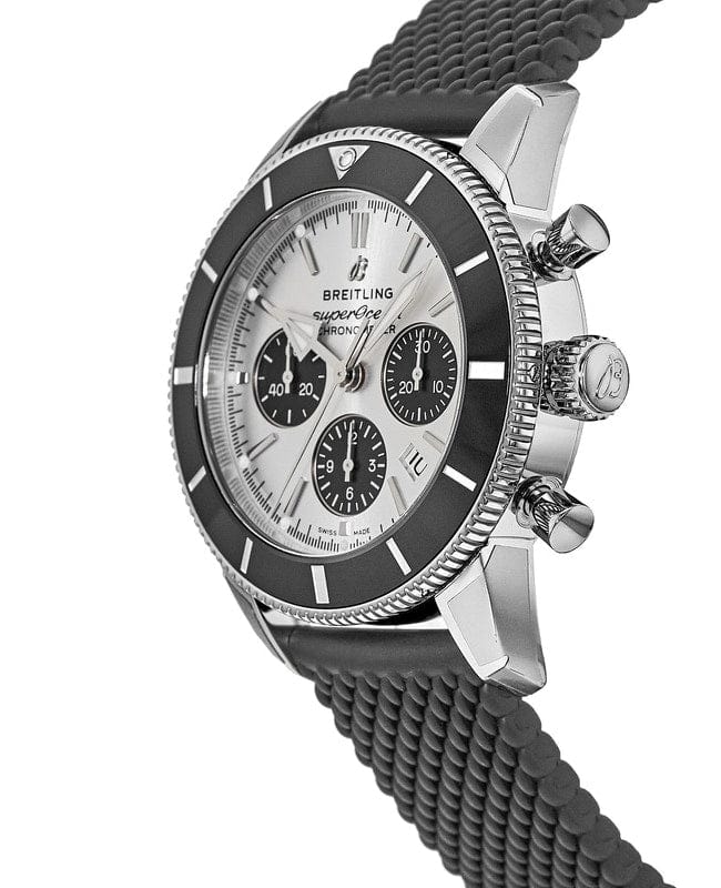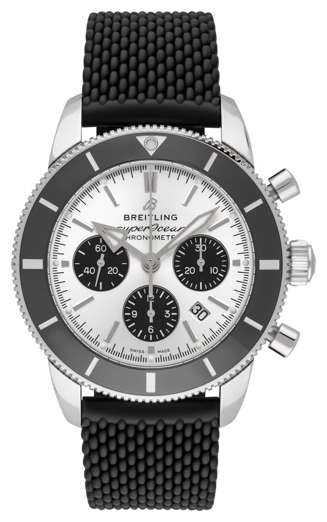 Available in a variety of materials including stainless steel and 18k red gold, the Superocean Heritage B01 Chronograph 44 features a range of black, blue, silver, or green dials. Offered either with a matching mesh bracelet, or a “mesh-styled” rubber strap fitting a folding buckle, this Superocean Heritage is powered by the in-house Breitling Manufacture Caliber 01, a COSC-certified chronometer.