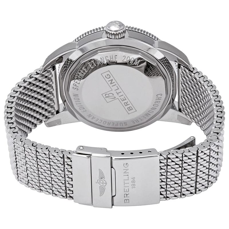 This striking model boasts a 44mm stainless steel case complemented by a mesh stainless steel bracelet. A blue unidirectional, ratcheted bezel further enhances this timepiece.