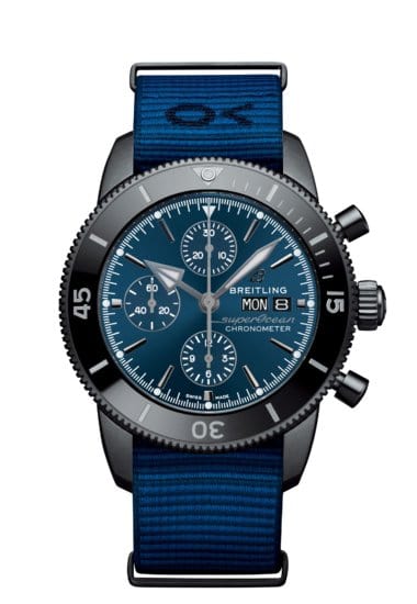The Superocean Heritage Chronograph 44 Outerknown celebrates Breitling’s partnership with sustainable apparel manufacturer Outerknown, co-founded by surfing legend Kelly Slater. The watch features a single-piece strap crafted from ECONYL® yarn, an innovative material created from nylon waste. With its black DLC-coated stainless steel case, bold blue dial, and unique blue strap, it makes a dramatic style statement and creates a powerful link to our oceans.