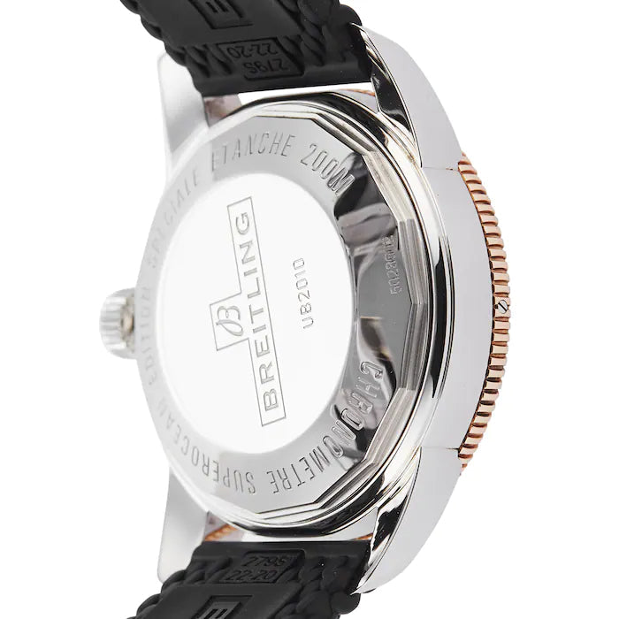 Breitling Superocean Heritage II 42mm watch. Model reference: UB2010121B1S1. The stylish timepiece has been designed to meet the professional needs of military divers in deep waters. Its rounded 42mm case of 14.35mm thickness is made of polished stainless steel and features a unidirectional rotating bezel of rose gold and black ceramic. The black dial has applied indexes and stylized hands with luminous fill for hour and minute marking. The thin hand serves for seconds tracking. The big date window is placed at the 6 o’clock. The B20 mechanical movement is wound automatically. It contains 28 jewels and features 70-hour power reserve. The strap is made of black rubber and fitted with a deployant buckle. It is water resistant up to 200m.