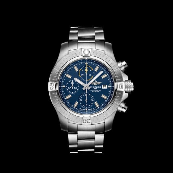 Bold, extremely robust and shock resistant, the Avenger Chronograph 45 combines precision with a powerful design. As a true Breitling Avenger, it can be used wearing gloves and offers unrivalled safety and reliability to any airborne adventurer. The Avenger Chronograph 45 features a sturdy 45mm stainless-steel case, black or blue dial and a choice of a stainless-steel bracelet, or matching black or blue military leather strap that fits either a stainless-steel pin buckle or folding clasp. Thanks to its rugged bezel and its special grip-pattern on the crown & chronograph pushers, the Avenger Chronograph 45 can be easily operated wearing gloves.