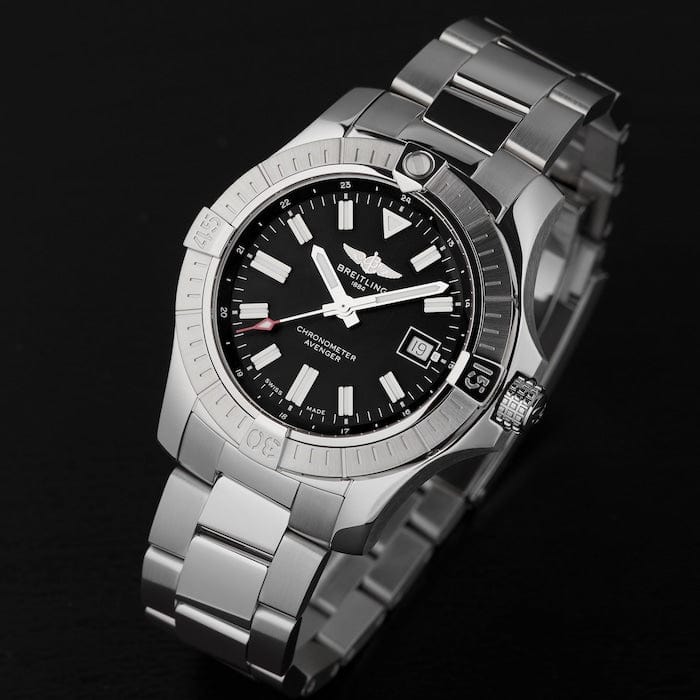 The Breitling Avenger Automatic 43mm is bold and reliable. Aesthetically pleasing to the eye with its clean black dial featuring Super-LumiNova hands and indices, the rugged bezel and special grip-pattern on the crown offer easy operation to any airborne adventurer. Housed in a stainless steel case and fitted on a matching metal bracelet that provides extra comfort for wearing on the wrist. Self-winding mechanical movement powered by Breitling 17 Calibre, this watch is for the daring gentleman.