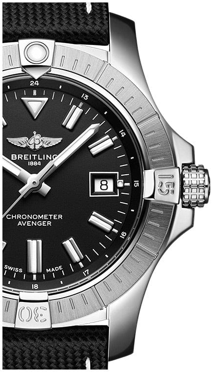 Bold, extremely robust and shock resistant, the Avenger Automatic 43 features a clean dial offering optimal legibility. As a true Breitling Avenger, it can be used wearing gloves and offers unrivalled safety and reliability to any airborne adventurer. The Avenger Automatic 43 features a sturdy 43mm stainless-steel case, black or blue dial and a choice of a stainless-steel bracelet, or matching black or blue military leather strap that fits either a stainless-steel pin buckle or folding clasp. Thanks to its rugged bezel and its special grip-pattern on the crown, the Avenger Automatic 43 can be easily operated wearing gloves.