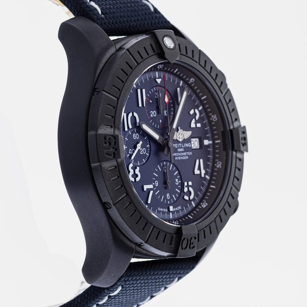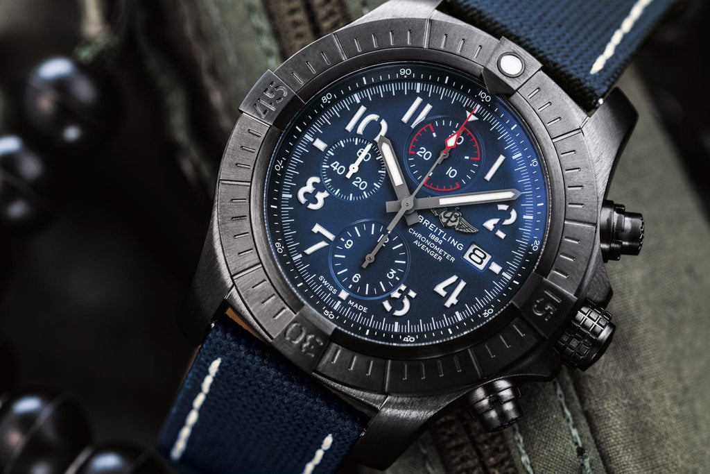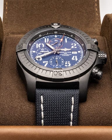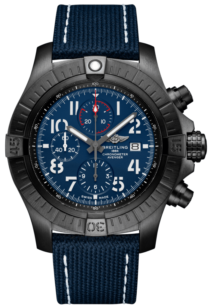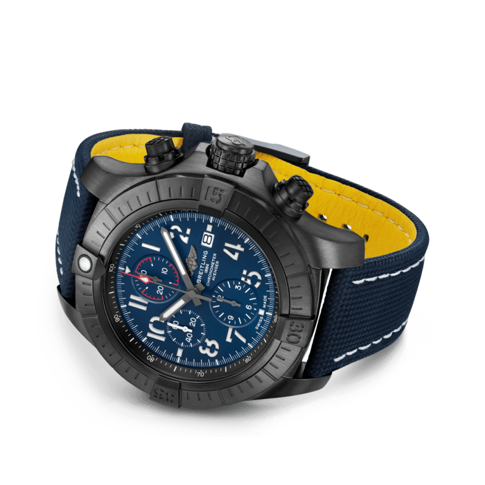 Bold, extremely robust and shock resistant, the Super Avenger Chronograph 48 Night Mission makes a big “here I am” statement with its strong but lightweight case. As a true Breitling Avenger, it can be used wearing gloves and offers unrivalled safety and reliability to any airborne adventurer. The Night Mission interpretation of the Super Avenger Chronograph 48 features a sturdy oversized 48mm DLC-coated titanium case, blue dial and a blue military leather strap that fits either a DLC-coated stainless-steel pin buckle or folding clasp. Its specific Arabic numerals recall the stenciled numbers used on the decks of aircraft carriers. Thanks to its rugged bezel and its special grip-pattern on the crown & chronograph pushers, the Super Avenger Chronograph 48 Night Mission can be easily operated wearing gloves.