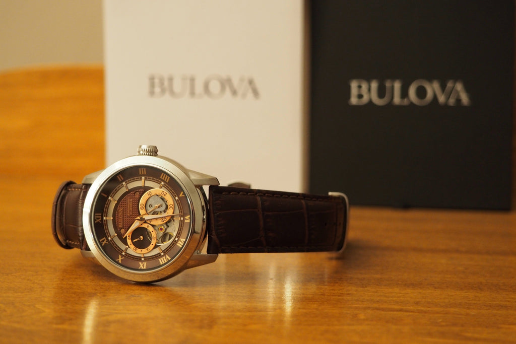 Bulova Stainless steel case with a brown leather strap. Fixed stainless steel bezel. Brown with skeletal display dial with luminous rose gold-tone hands and Roman numeral hour markers. Minute markers around an inner ring. Dial Type: Analog. Luminescent hands and markers. Two sub-dials displaying: 60 second and 24 hour. Hand wind movement. Scratch resistant mineral crystal. Pull / push crown. Transparent case back. Round case shape, case size: 42 mm, case thickness: 11.2 mm. Band width: 22 mm. Tang clasp. Water resistant at 30 meters / 100 feet. Functions: hour, minute, second. Dress watch style. Bulova Classic Hand Wind Brown Dial Mens Watch 96A120.