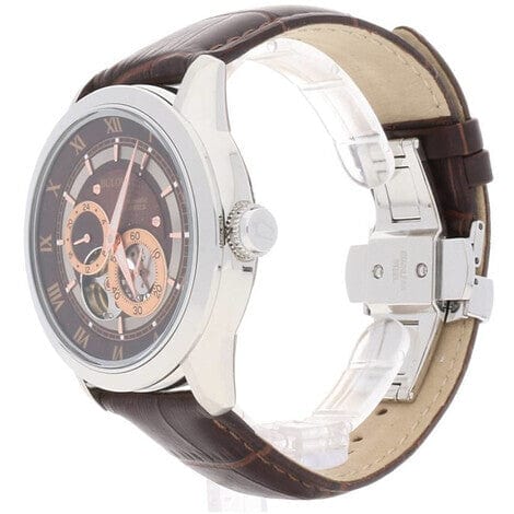 Automatic movement with 21 jewels that reduce friction and thus improve accuracy - visible through openings in the dial and case back. Screw down stainless steel case with domed crystal glass, brown patterned dial with rose gold accents and luminous fill hands. Brown leather strap with double-push folding clasp. Water resistance up to 30 meters.