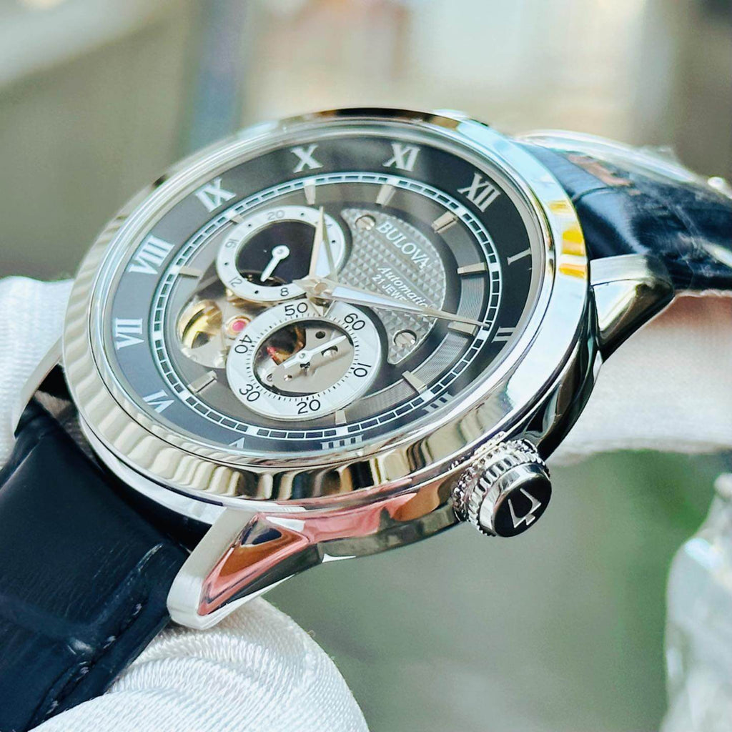 Bulova BVA Classic Automatic Silver Dial Black Leather Strap Watch for Men - 96A135