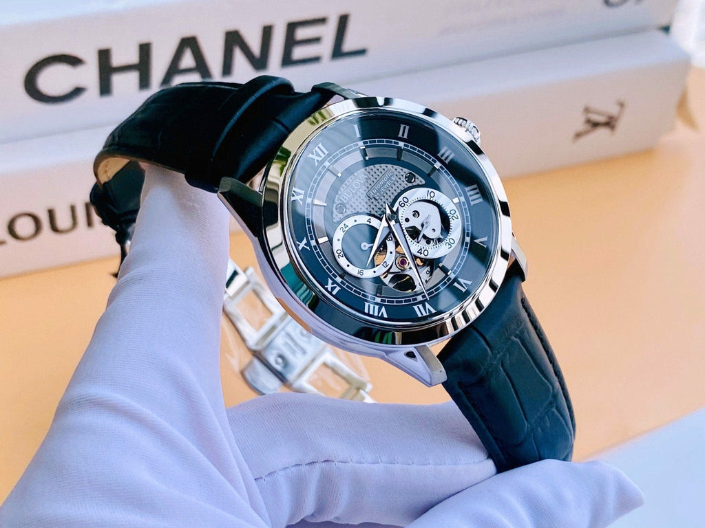 In stainless steel with domed metallized crystal, patterned black and grey dial, luminous hands and markers, 24-hour subdial, small sweep, screw-back case, black leather strap, and secure double-press deployant closure. Water resistance upto 30 metres. Case size 42 mm.
