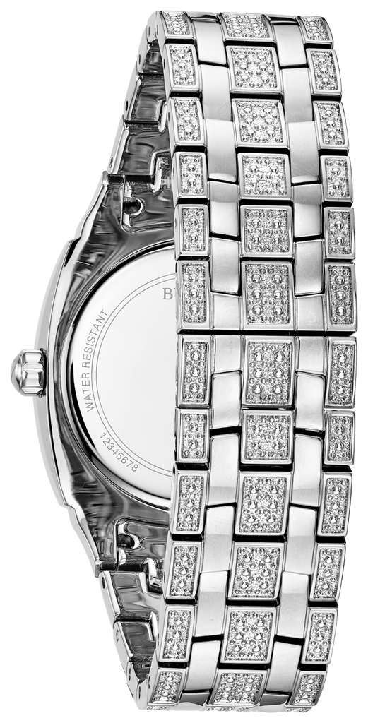 From the Crystal Collection. Featuring the unique, luxurious look of a case, bezel, dial, and bracelet finished in silver-tones and set with 412 crystals, this Bulova Men's Crystal Day-Date Watch is a truly unique addition to any wardrobe.