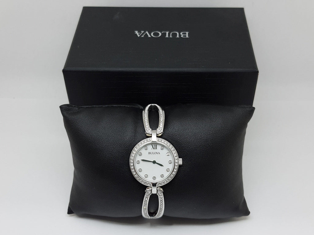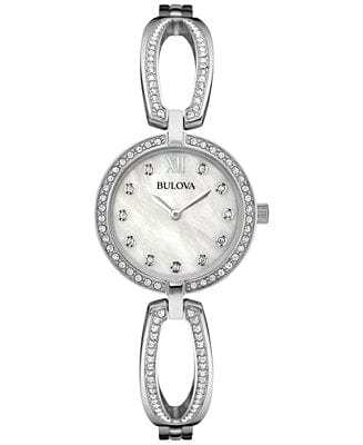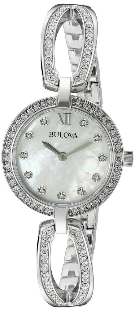 Stainless steel case with a stainless steel bracelet set with Swarovski crystals. Fixed stainless steel bezel set with Swarovski crystals. Mother of pearl dial with silver-tone hands and crystal hour markers. Roman numeral appears at the 12 o'clock positions. Dial Type: Analog. Quartz movement. Scratch resistant mineral crystal. Pull / push crown. Solid case back. Round case shape. Case size: 26 mm. Case thickness: 6.1 mm. Jewelry clasp. Water resistant at 30 meters / 100 feet. Functions: hour, minute. Dress watch style. Bulova Quartz Crystal Ladies Watch 96L223.