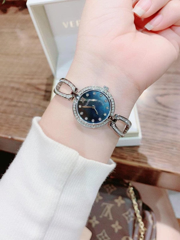 - Black mother of pearl dial with crystal markers, silver-tone Roman numeral, two hands and Bulova logo