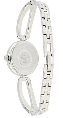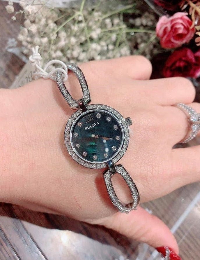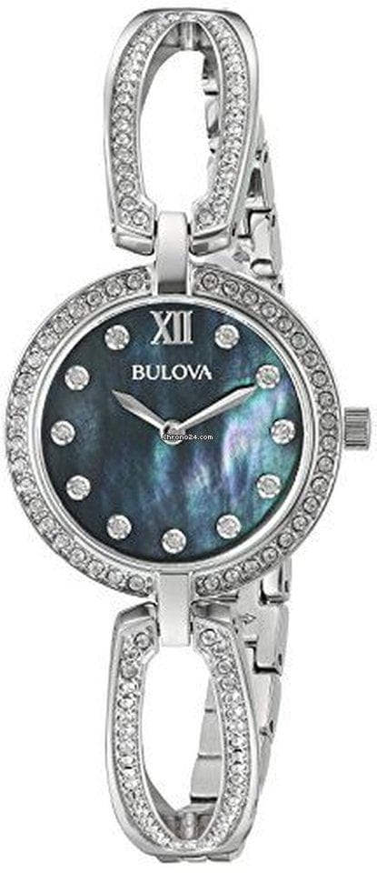 Dress her wrist in the elegant luxury of this Bulova dress watch. Crafted in stainless steel, this quality timepiece features a black mother-of-pearl dial, silver-toned hands, and crystal-accent markers. The crystal-accented bezel and bangle bracelet creates a sleek profile, and the bracelet secures with a jewelry clasp. Ensuring accuracy, the Japanese quartz movement keeps you right on time. Water-resistant to 30 meters, this wristwatch includes a three-year limited manufacturer's warranty. We are an authorized Bulova dealer.