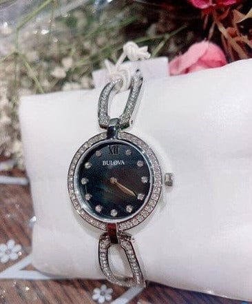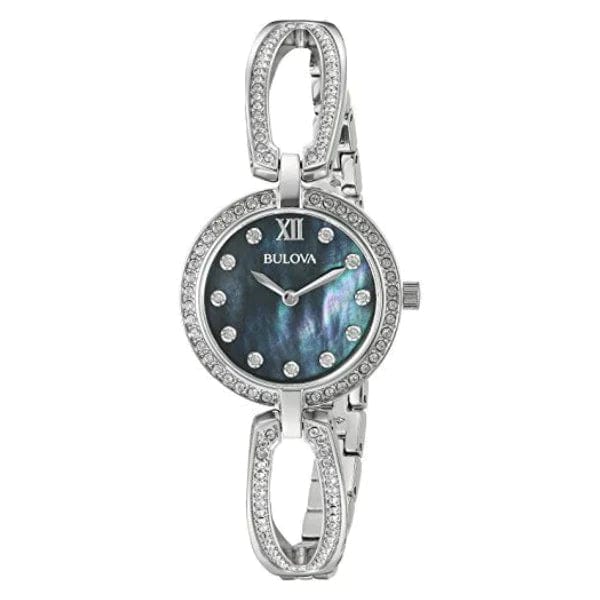 Bulova Crystal Black Mother of Pearl Dial Silver Steel Strap Watch for Women - 96L224