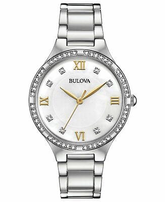 Expertly crafted, the Bulova Crystal Collection watch for women boasts a mother of pearl dial and silver steel strap. Perfect for everyday wear, this watch is a stylish addition to any outfit. Trust in Bulova's precision timekeeping with this elegant timepiece.