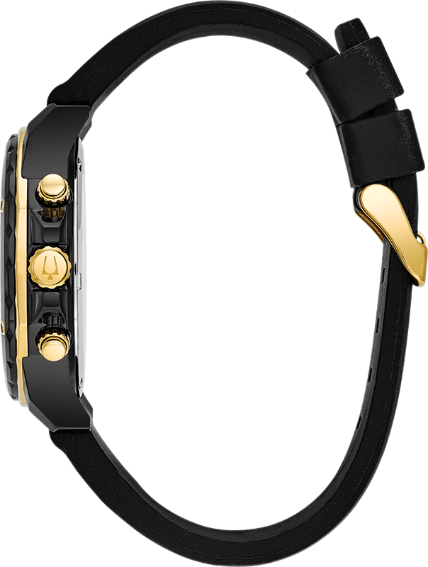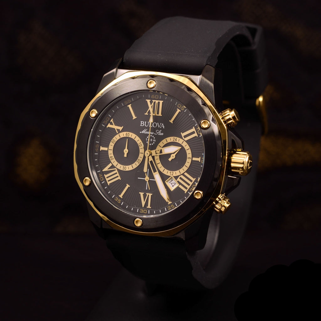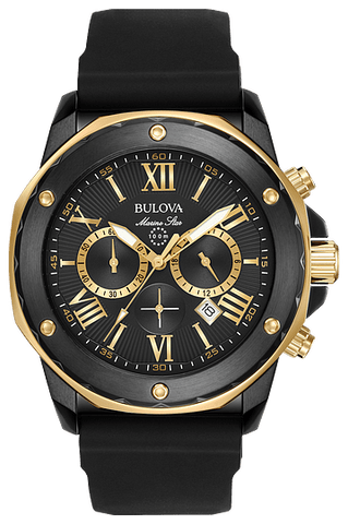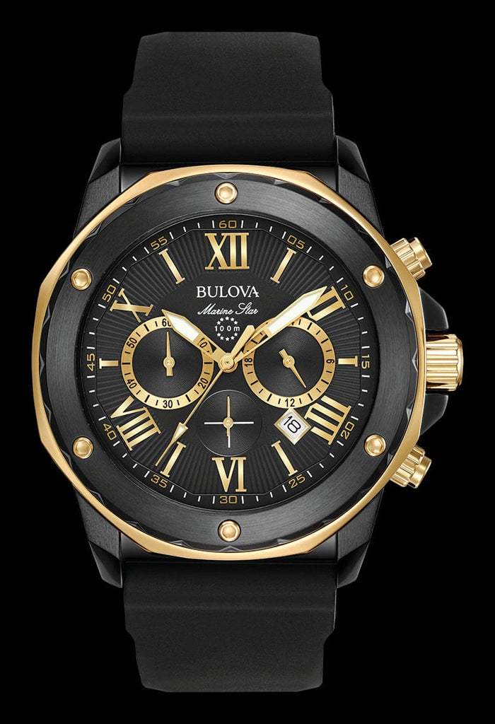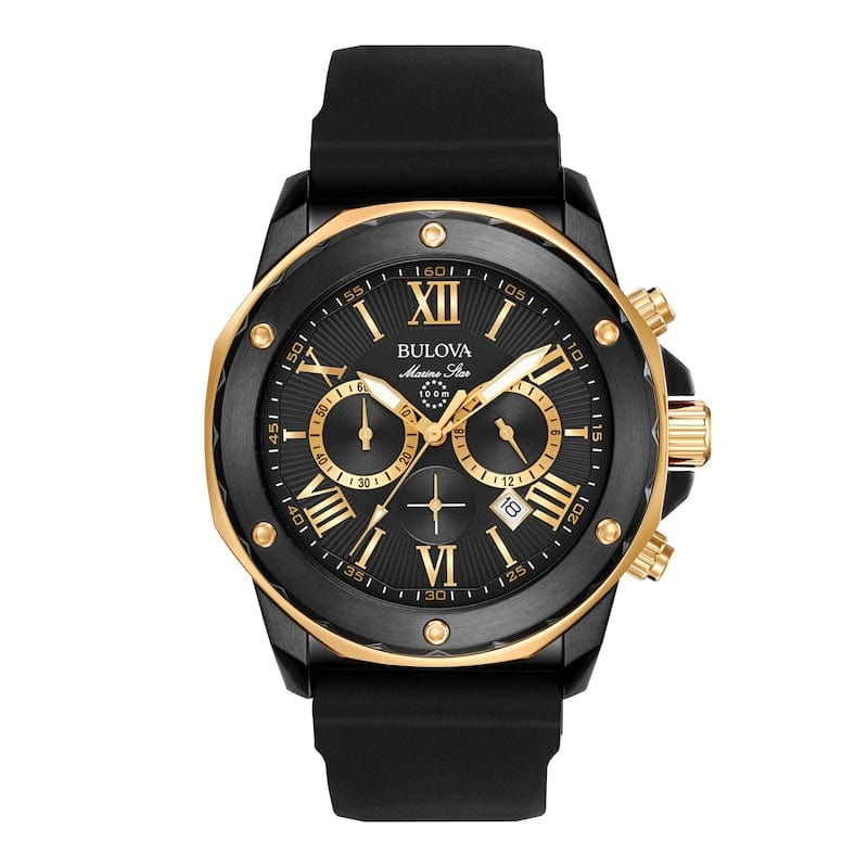 This men's chronograph watch from the Marine Star collection by Bulova features a black dial, yellow-gold-tone accents, three timing subdials and a date window set in a black ion-plated stainless steel case. A mineral crystal tops the case, while a buckle secures the black silicone strap. The men's watch has a quartz chronograph movement, and is water-resistant to 100 meters.