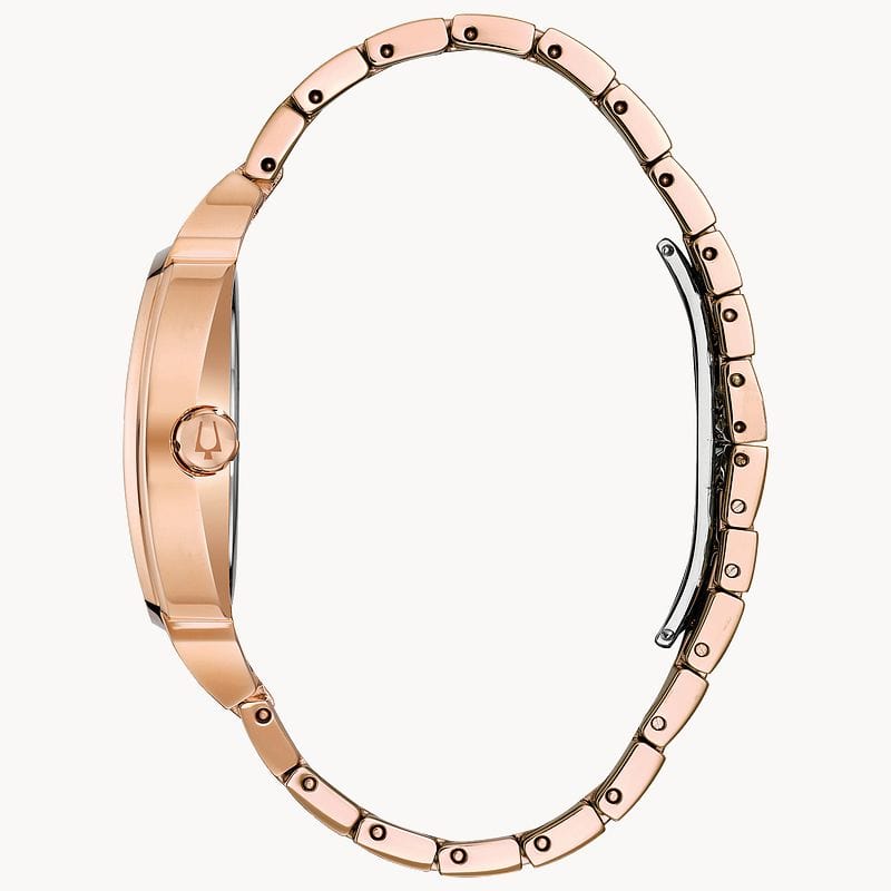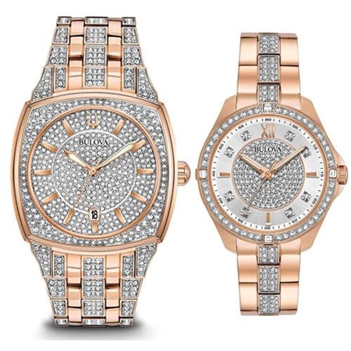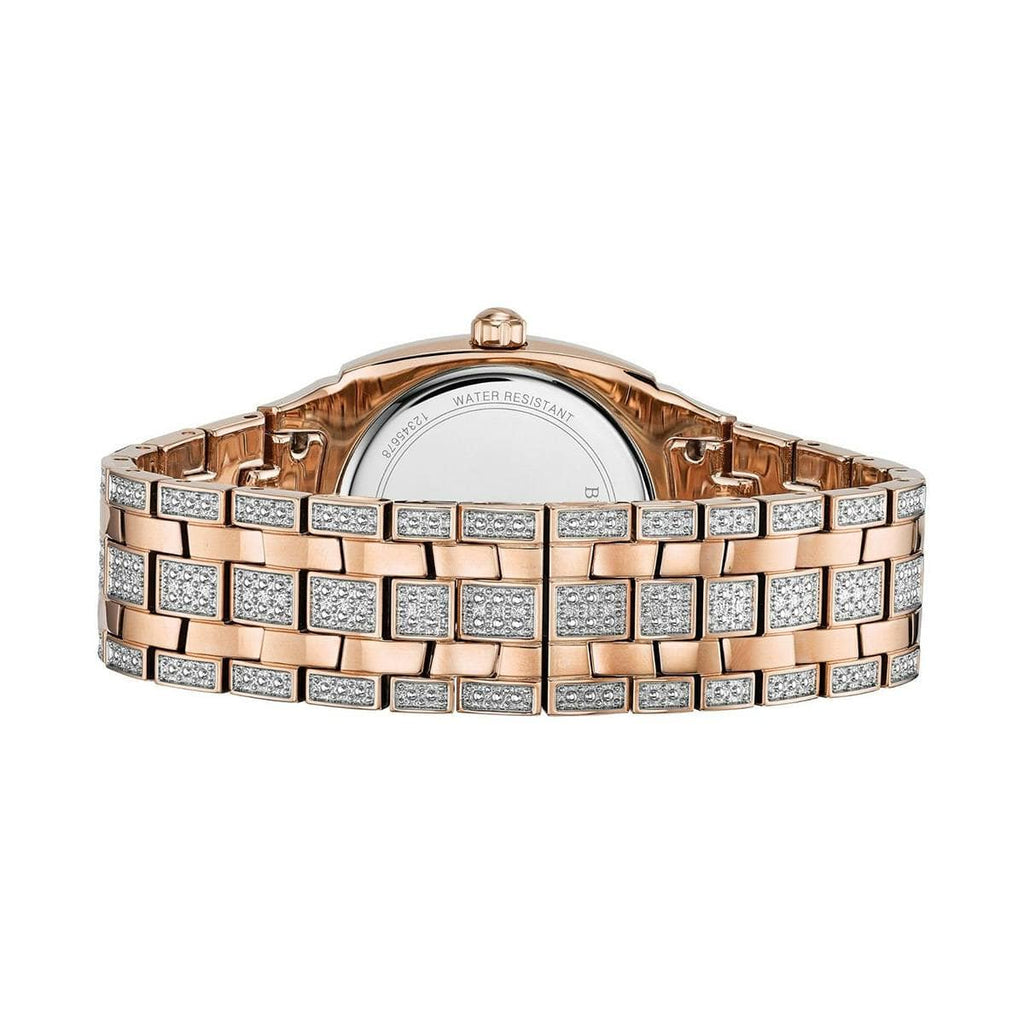 Dress watch opulently embellished with 582 crystals on the cushion-shaped stainless steel and rose gold-tone case and bracelet, and round pave set three-hand silver white dial with date feature. Curved mineral crystal, deployant closure, quartz movement, and water resistance to 30 meters. Color: Rose Gold.