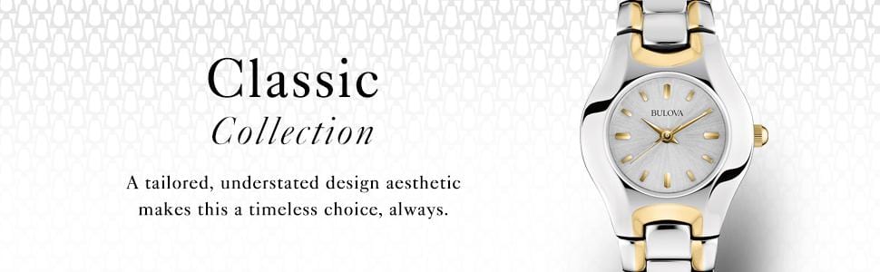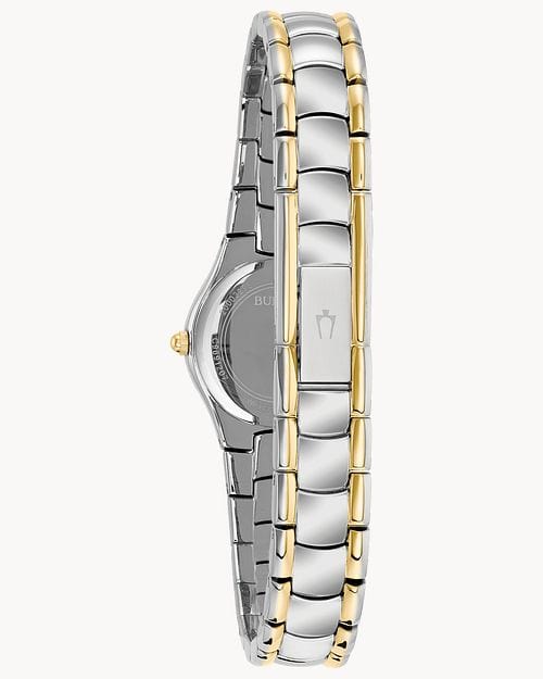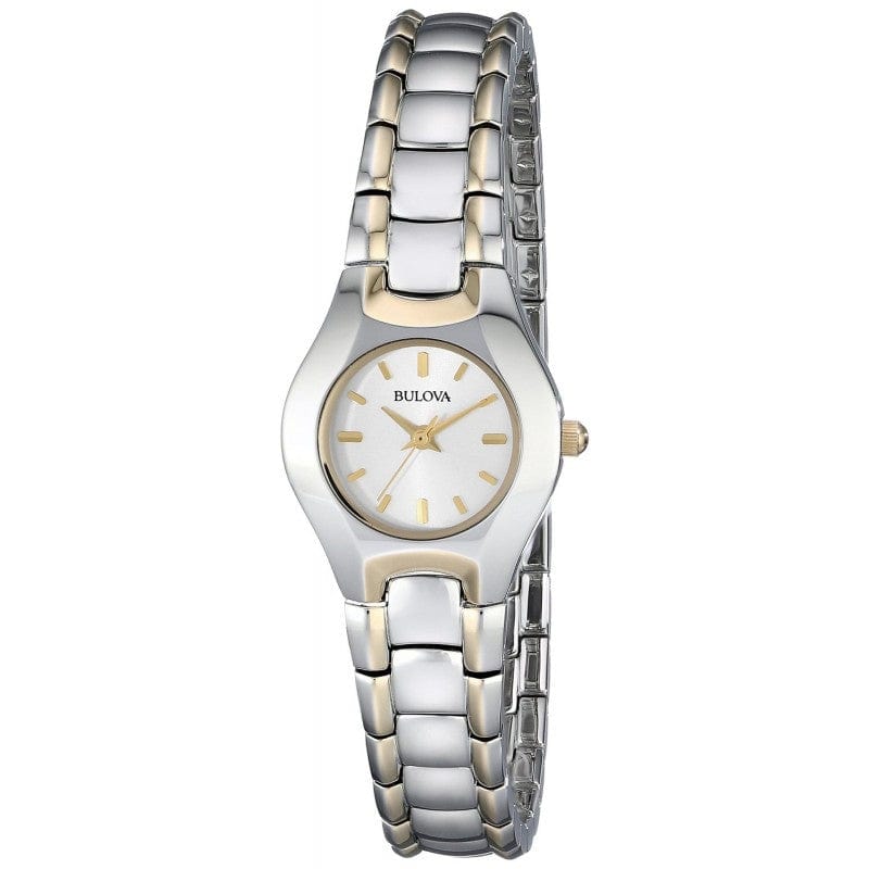 For every wearing occasion from sport to casual professional to dress Bulova's signature brand delivers exceptional design and style enhanced by technology. Paced by its exquisitely crafted diamond watches meticulously engineered self-winding mechanicals and the innovative architectural lines within the high-performance Marine Star collection Bulova's diverse selection encompasses classic and contemporary styling and technology. Bulova Ladies Bracelet Watch White Dial Two Tone Stainless Steel Case and Bracelet Curved crystal with metalized rim Water resistant to 30 meters/100feet Two-Year Limited from Bulova- SKU: BUL688