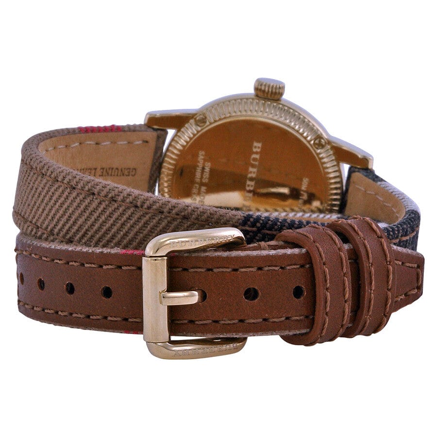 Gold-tone stainless steel case with a Burberry check canvas (leather backed) double wrap strap. Fixed gold-tone bezel. White dial with luminous gold-tone hands and index hour markers. Arabic numerals mark the 3, 6, 9 and 12 o'clock positions. Minute markers around the outer rim. Dial Type: Analog. Quartz movement. Scratch resistant sapphire crystal. Pull / push crown. Solid case back. Case diameter: 30 mm. Round case shape. Band width: 14 mm. Tang clasp. Water resistant at 50 meters / 165 feet. Functions: hour, minute, second. Casual watch style. Watch label: Swiss Made. Burberry Utilitarian White Dial Burberry Check Canvas Ladies Watch BU7851.