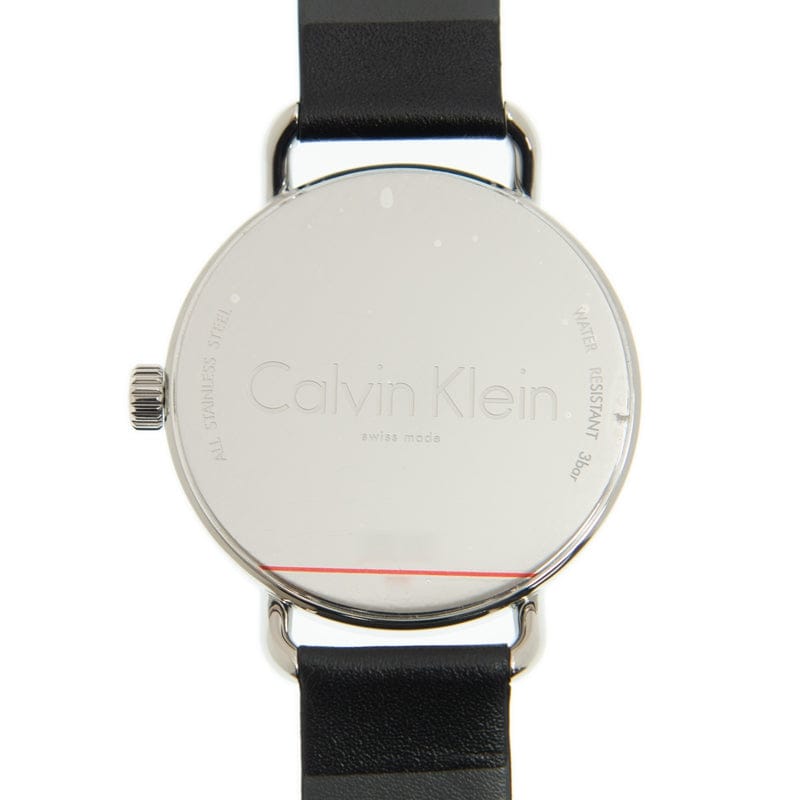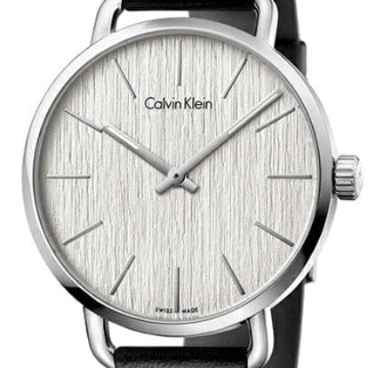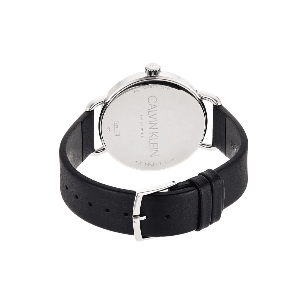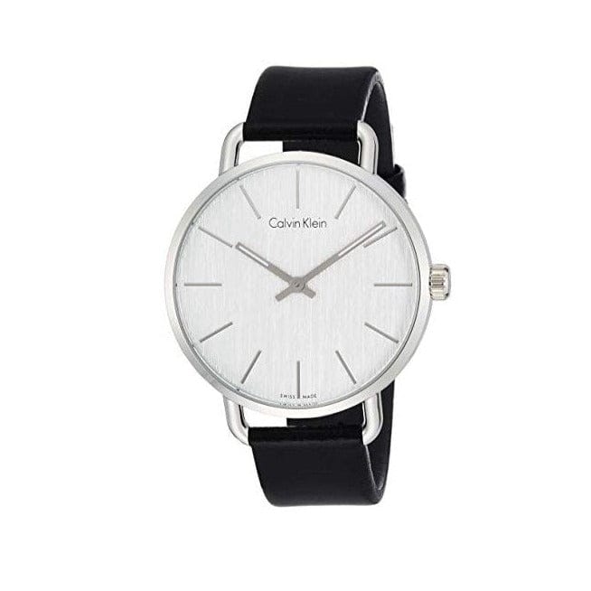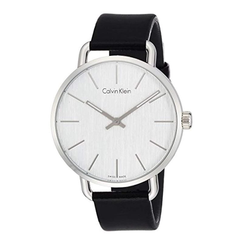 Stainless steel case with a black leather strap. Fixed stainless steel bezel. Silver dial with silver hands and index hour markers. Dial type: analog. Luminescent hands. Quartz movement. Scratch resistant mineral glass. Pull/push the crown. Solid back. Round box shape. Case size: 41mm. Case thickness: 7 mm. Band width: 19 mm. Tang closure. Water resistant to 30 meters / 100 feet. Functions: hour, minute. Casual watch style. Watch label: Swiss Made. Calvin Klein Even Women's Silver Dial Quartz Watch K7B211C6.