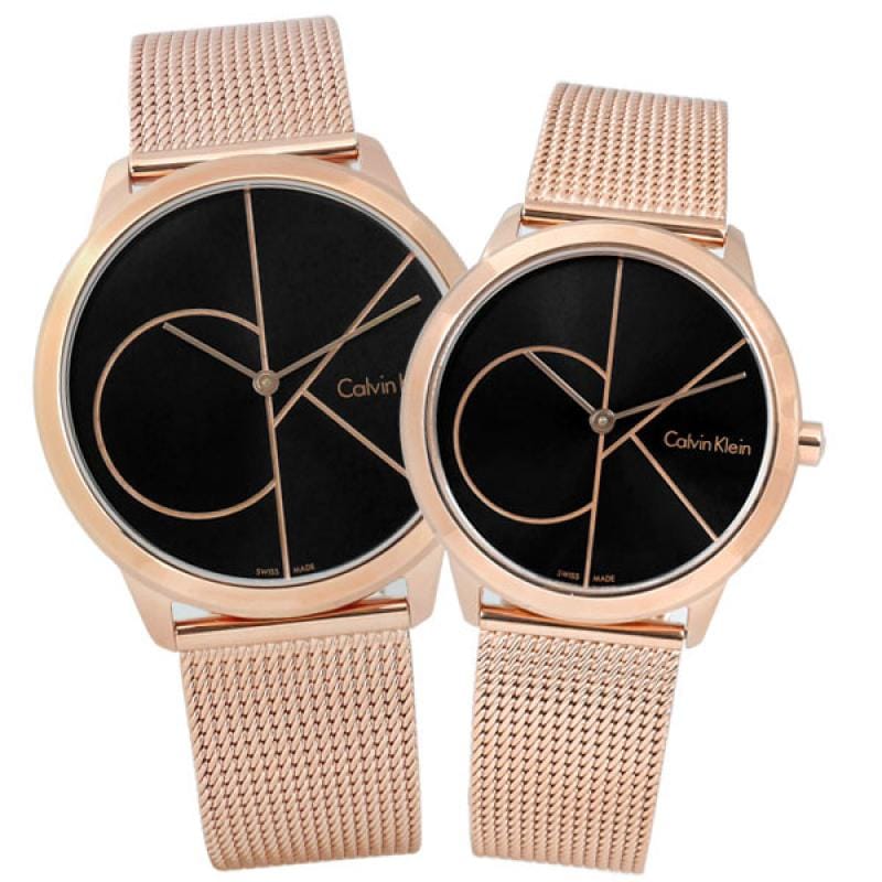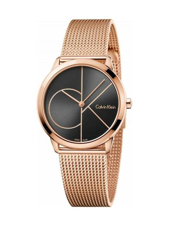 Calvin Klein Minimal' men's watch with rose gold finish from Calvin Klein, world famous creator of watches and jewellery. Men's watch with rose gold finish case and mesh strap, black round dial with mineral crystal glass, analogue display, quartz movement.