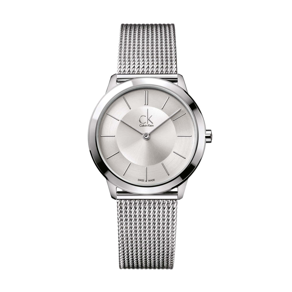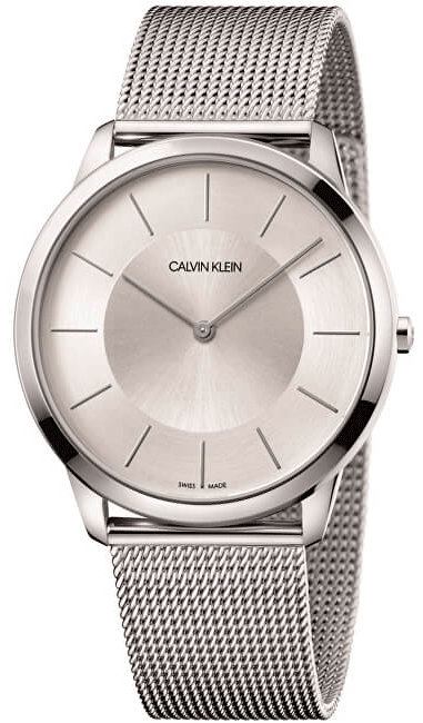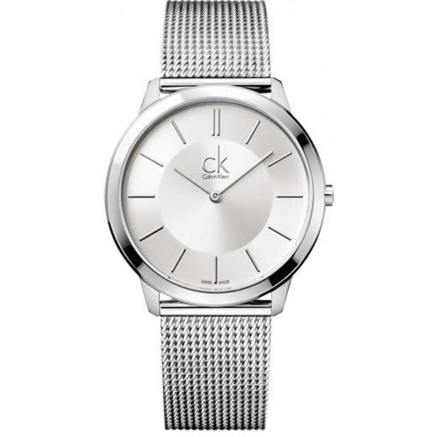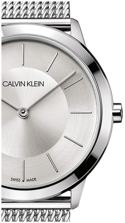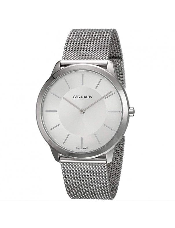 Mens Calvin Klein Minimal watch in stainless steel, set around a sleek silver dial with baton hour markers. The watch fastens with a textured bracelet.