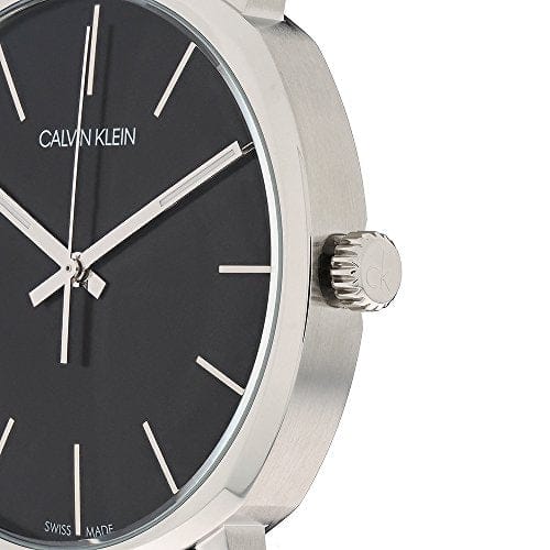 Stainless steel case with a black leather strap. Fixed stainless steel bezel. Black dial with luminous silver-tone hands and index hour markers. Dial Type: Analog. Luminescent hands. Quartz movement. Scratch resistant mineral crystal. Pull / push crown. Solid case back. Round case shape. Case size: 40 mm. Case thickness: 10 mm. Band width: 22 mm. Tang clasp. Water resistant at 30 meters / 100 feet. Functions: hour, minute. Casual watch style. Watch label: Swiss Made. Calvin Klein Posh Quartz Black Dial Men's Watch K8Q311C1.