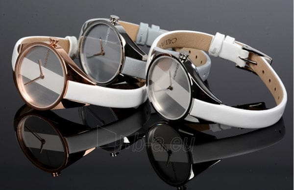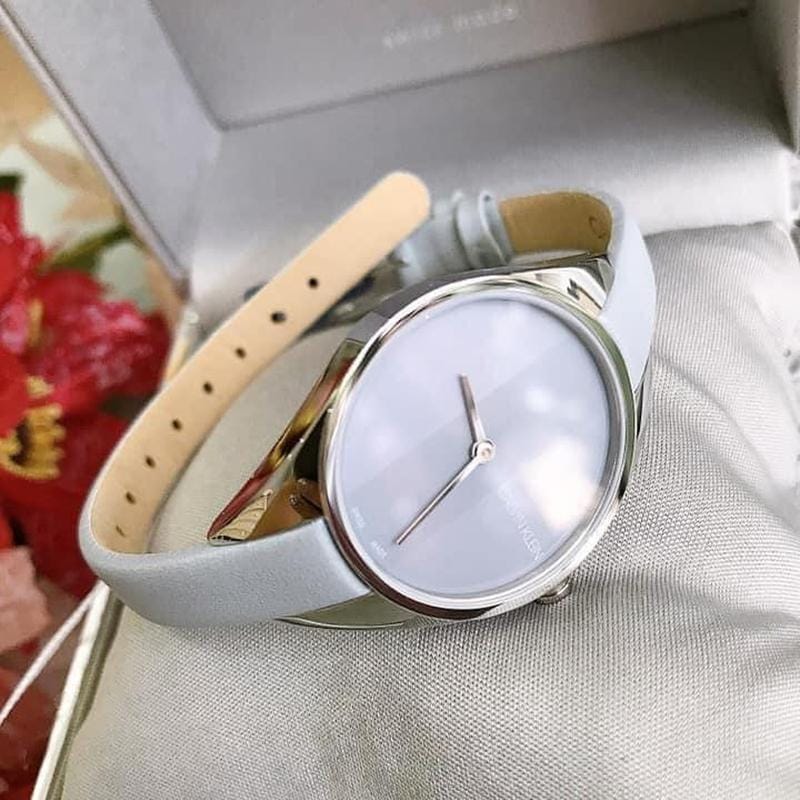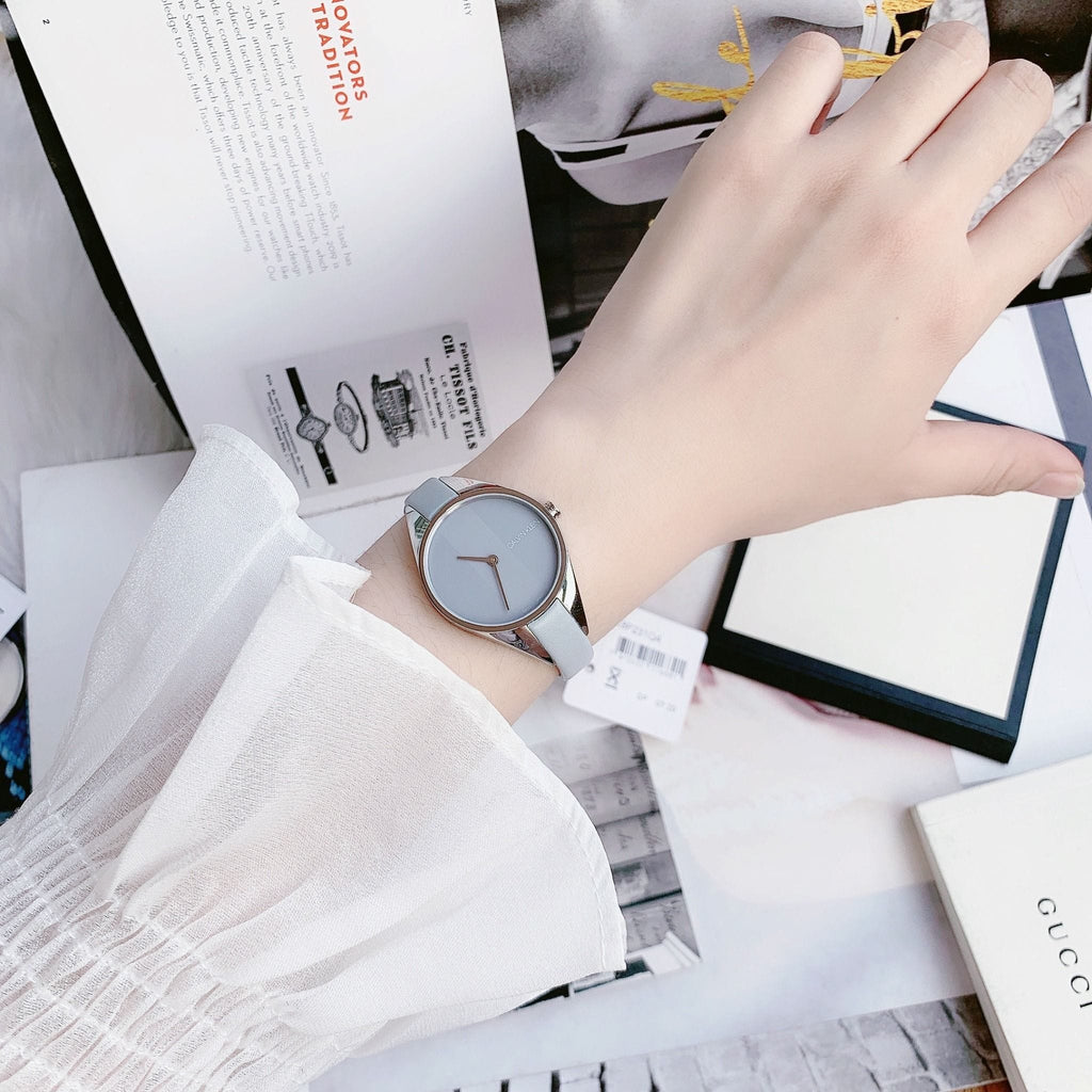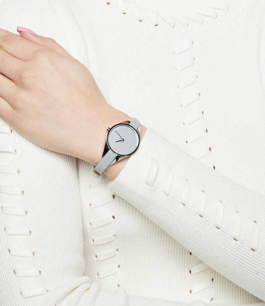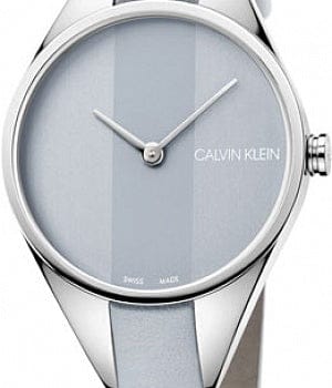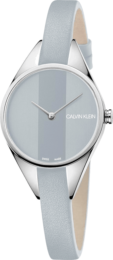 Stainless steel case with a light grey leather strap. Fixed stainless steel bezel. Light grey dial with steel hands. No markers. Dial Type: Analog. Quartz movement. Scratch resistant mineral crystal. Pull / push crown. Solid case back. Round case shape. Case size: 29 mm. Case thickness: 7 mm. Band width: 8 mm. Tang clasp. Water resistant at 30 meters / 100 feet. Functions: hour, minute. Rebel Series. Casual watch style. Watch label: Swiss Made. Calvin Klein Rebel Light Grey Dial Ladies Watch K8P231Q4.