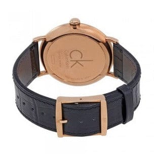 Rose gold-tone stainless steel case with a black leather strap. Fixed rose gold-tone stainless steel bezel. Black dial with rose gold-tone hands and index hour markers. Dial Type: Analog. Luminescent hands and markers. Quartz movement. Scratch resistant mineral crystal. Pull / push crown. Solid case back. Case size: 43 mm. Case thickness: 8 mm. Round case shape. Band width: 22 mm. Water resistant at 30 meters / 100 feet. Functions: hour, minute, second. Dress watch style. Watch label: Swiss Made. Calvin Klein Surround Black Dial Men's Watch K3W216C1.