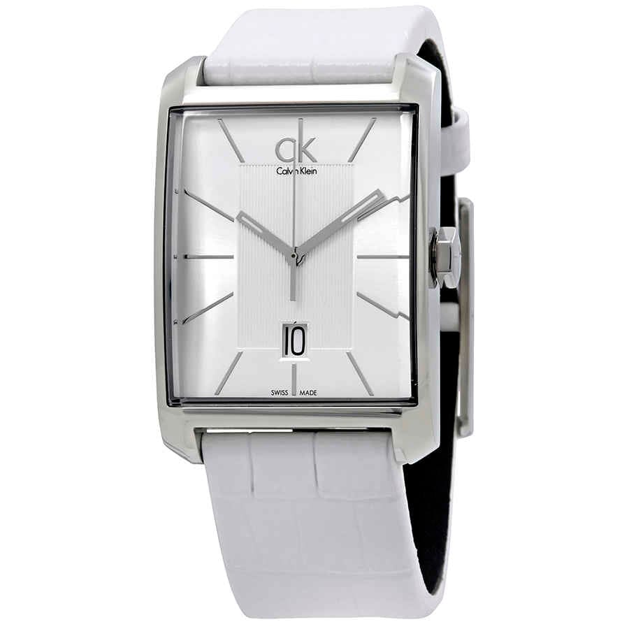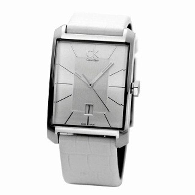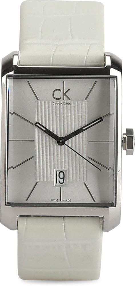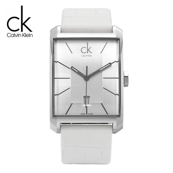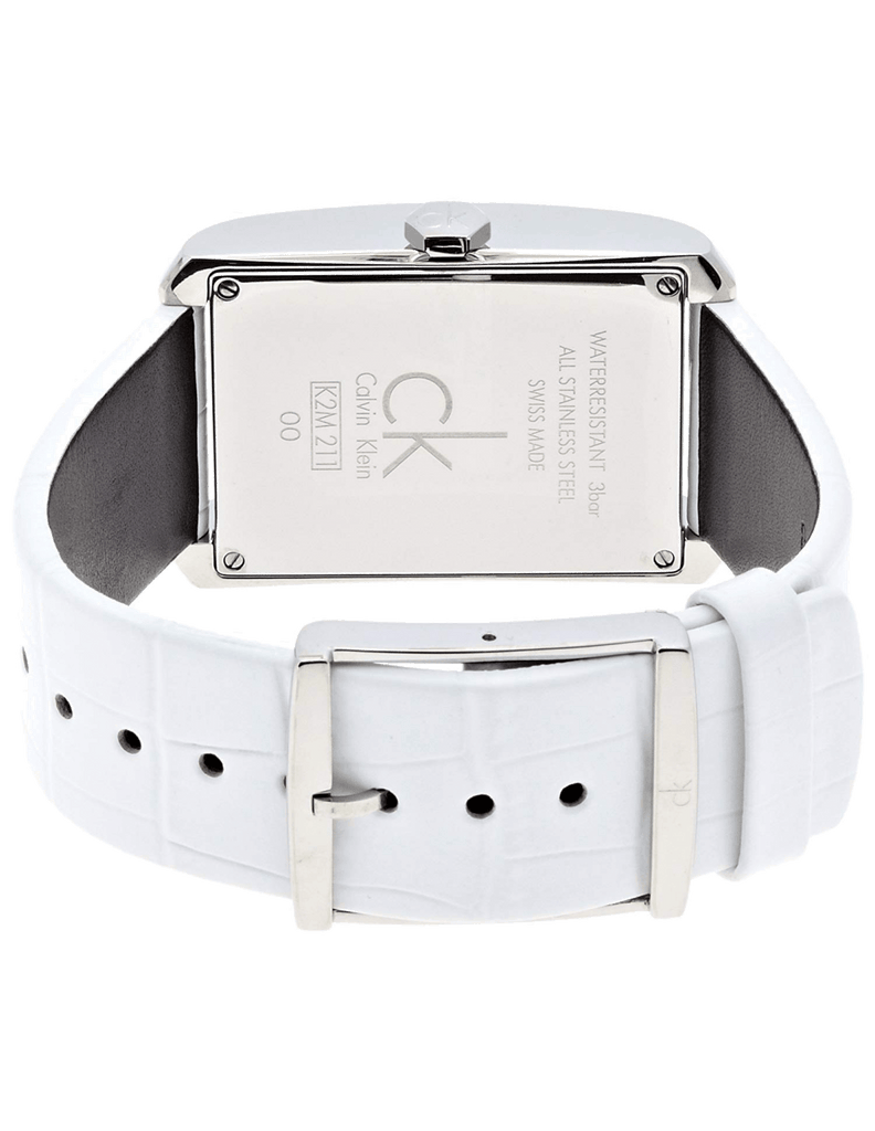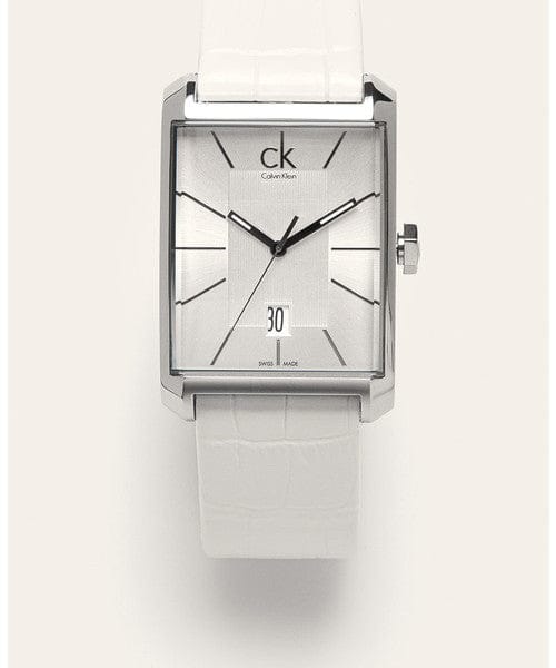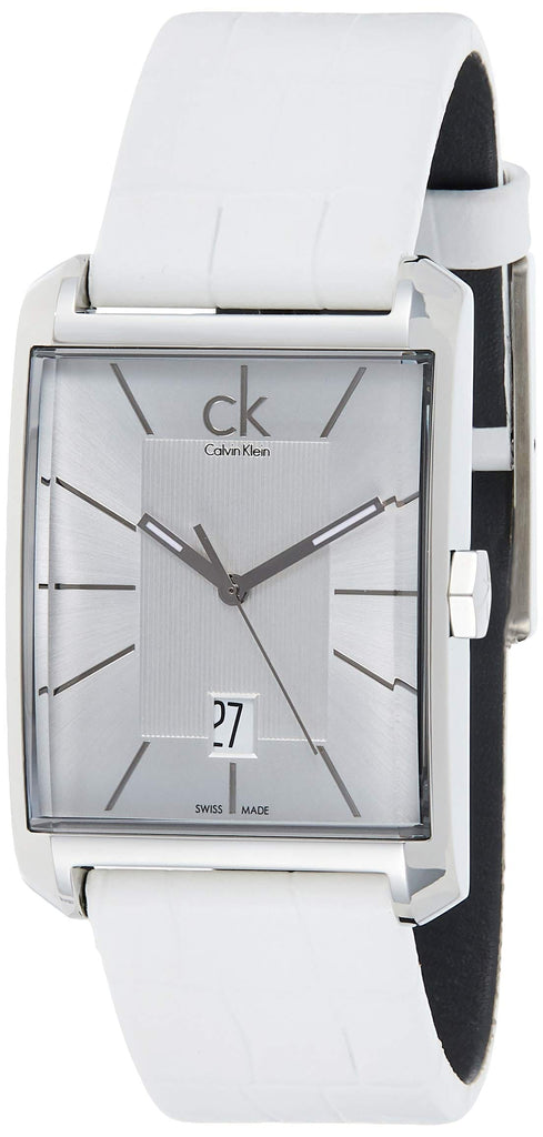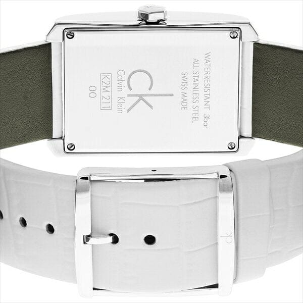Calvin Klein K2M21120 is equipped with a 22mm wide genuine white leather strap with a buckle clasp. Calvin Klein K2M21120 men's Window silver dial Swiss quartz watch is brand new and comes in an original Calvin Klein gift box and is backed by a 2 year store limited warranty.