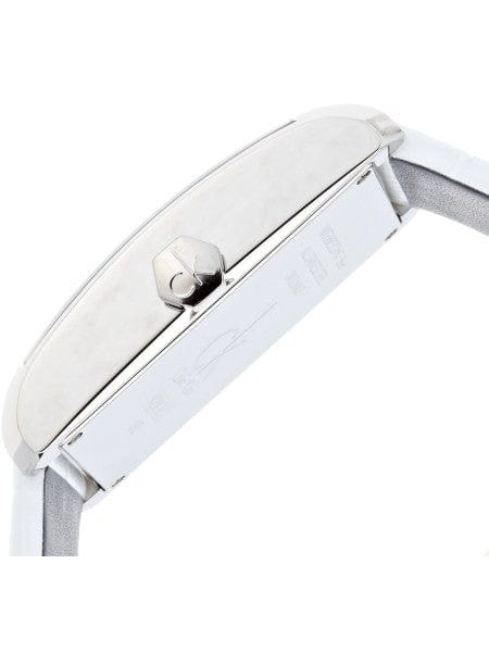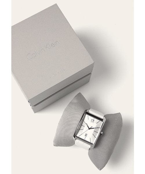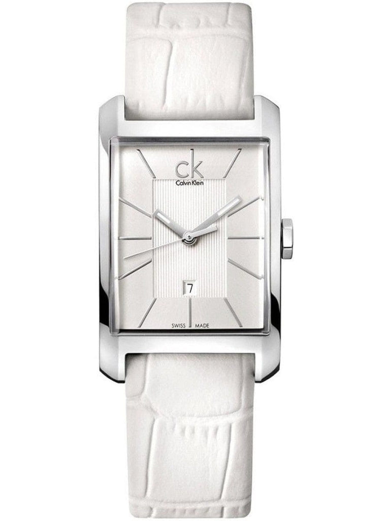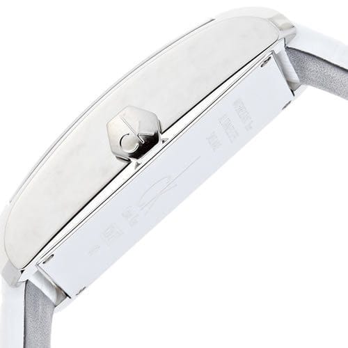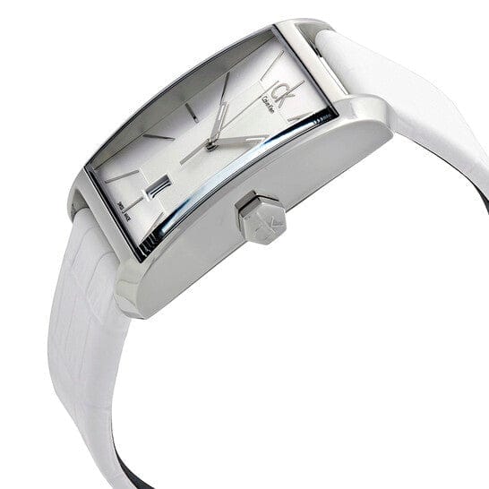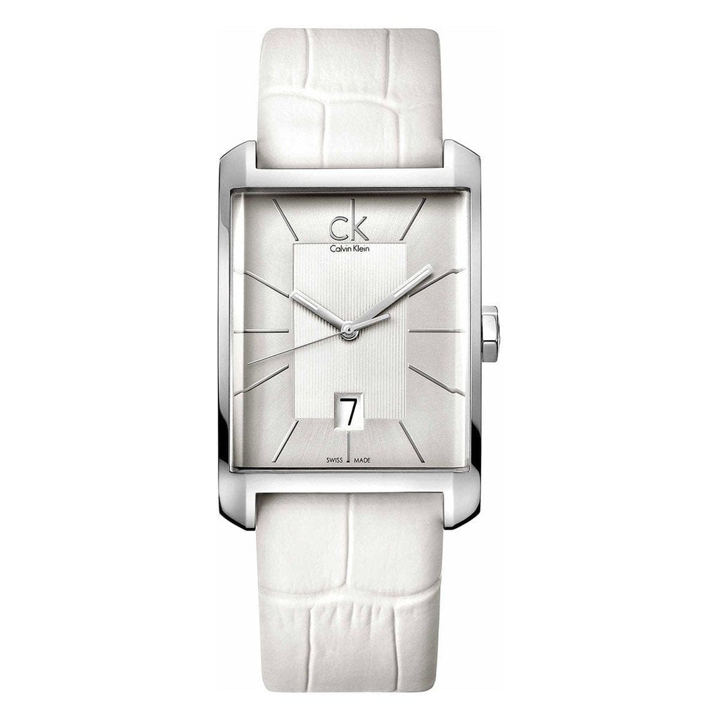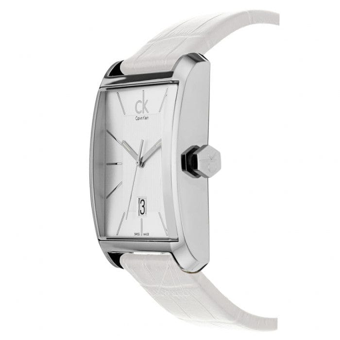 Calvin Klein K2M21120 is equipped with a 22mm wide genuine white leather strap with a buckle clasp. Calvin Klein K2M21120 men's Window silver dial Swiss quartz watch is brand new and comes in an original Calvin Klein gift box and is backed by a 2 year store limited warranty.