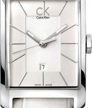 Calvin Klein K2M21120 Window men's watch features a 31mm wide and 11mm thick solid stainless steel case with a fixed bezel and textured push-pull crown. Calvin Klein K2M21120 is powered by Swiss Made quartz movement. This stylish watch also features a textured shiny sunray silver tone dial with white accents silver tone luminous hands and index hour markers along with the date display function, scratch resistant mineral crystal and water resistant to 30 meters.