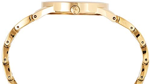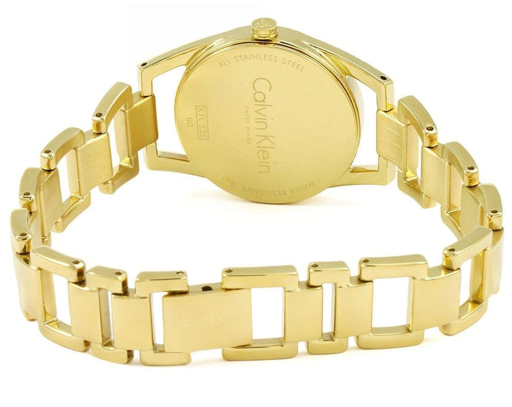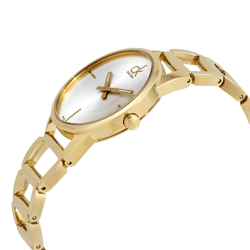 Yellow gold-tone stainless steel case and bangle bracelet. Fixed yellow gold-tone bezel. Silver dial with luminous yellow gold-tone hands. Index markers at the 3, 6 and 9 o'clock positions. Dial Type: Analog. ETA caliber 901.001 quartz movement. Scratch resistant sapphire crystal. Pull / push crown. Solid case back. Round case shape. Case size: 33.50 mm. Case thickness: 8 mm. Band width: 20 mm. Jewelry clasp. Water resistant at 30 meters / 100 feet. Functions: hour, minute. Casual watch style. Watch label: Swiss Movt. Calvin Klein Stately Quartz Silver Dial Ladies Watch K3G23526.