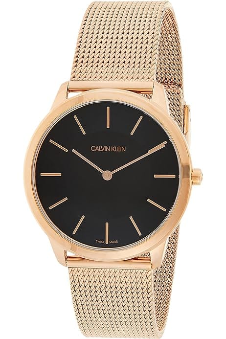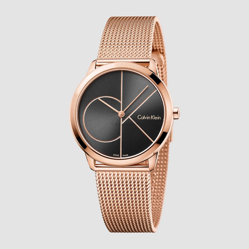 Rose gold PVD stainless steel case with a rose gold PVD stainless steel mesh bracelet. Fixed rose gold PVD bezel. Black dial with rose gold-tone hands. No markers. Dial Type: Analog. Quartz movement. Scratch resistant mineral crystal. Pull / push crown. Solid case back. Round case shape. Case size: 35 mm. Case thickness: 7 mm. Band width: 16 mm. Fold over slip through clasp. Water resistant at 30 meters / 100 feet. Functions: hour, minute. Minimal Series. Casual watch style. Watch label: Swiss Made. Calvin Klein Minimal Quartz Black Dial Ladies Watch K3M22621.