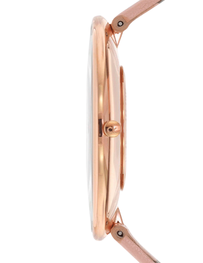 The Calvin Klein Full Moon women's quartz watch has a Swiss-made ETA F03.111 movement and a pull and push crown. The case is rose gold PVD with a 42 mm diameter, mineral crystal, fixed bezel, closed back, and water resistance of 30 m (100 feet). The dial is silver with rose gold tone hands. The band is pink leather with pin buckle clasp style.