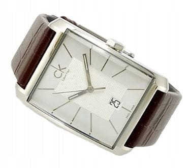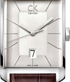 Mens Calvin Klein Window watch in stainless steel and leather, featuring a silver dial with baton hour markers and date function.