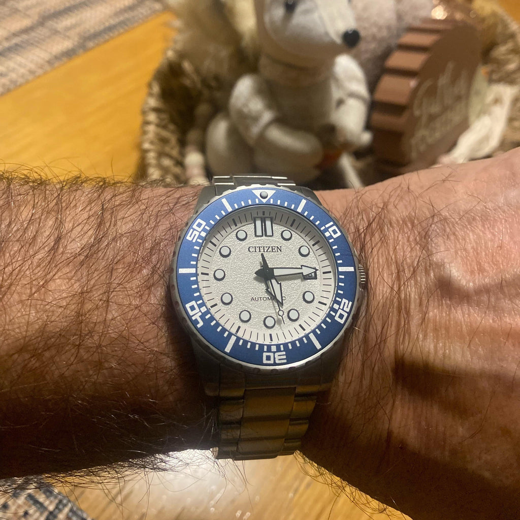 Citizen NJ0171-81A Metal Band Men Watch. The case is made out of silver stainless steel with a blue bezel, which stands for the high quality of the item, it has a white color dial. This model has got 100 meters of water resistance. it can be worn in scenarios where it is likely to be splashed but not immersed in water and will be fine in rain. The watch is shipped with an original box and a guarantee from the manufacturer.