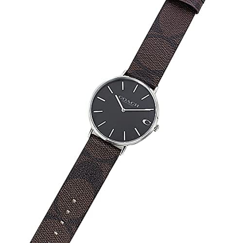 Solid case back. Round case shape, case size: 41 mm, case thickness: 8 mm. Band width: 20 mm. Buckle clasp. Water resistant at 30 meters / 100 feet. Functions: hour, minute. Casual watch style. Watch label: Japan Movt. Coach Charles Quartz Black Dial Men's Watch 14602156.
