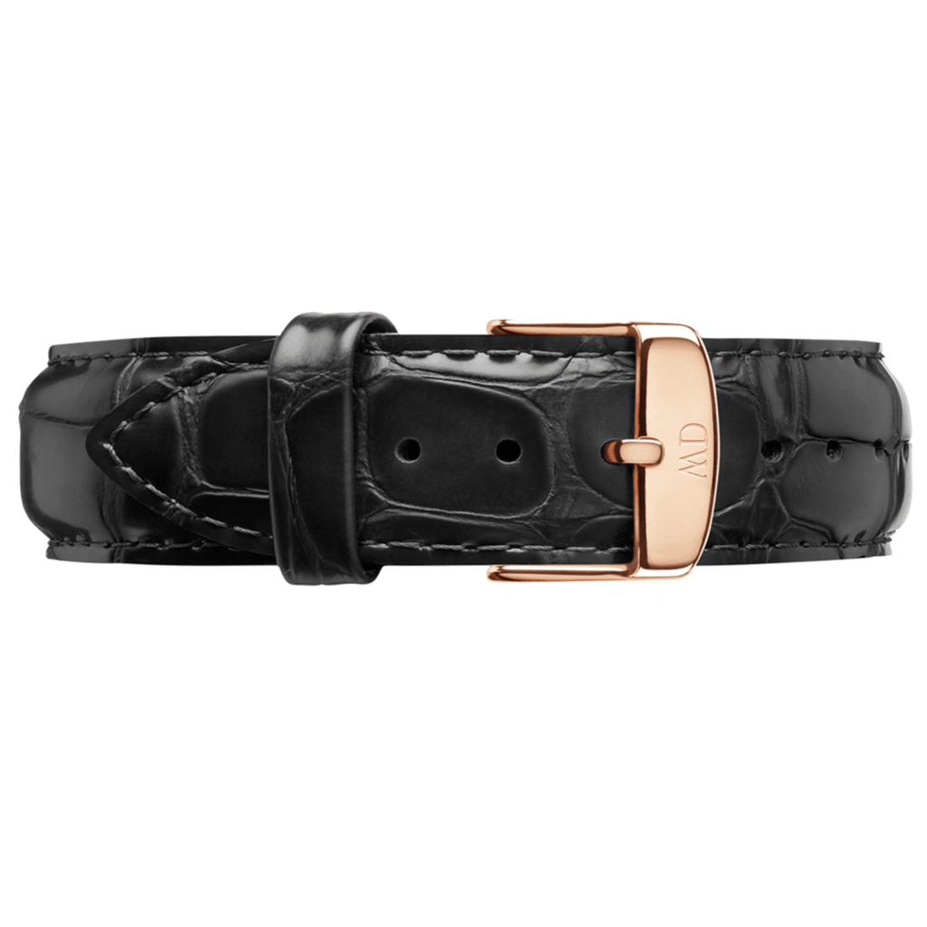 Rose gold-tone stainless steel case with a black leather strap. Fixed rose gold-tone bezel. Eggshell white dial with blue hands and Roman numeral hour markers. Dial Type: Analog. Date display at the 6 o'clock position. Quartz movement. Scratch resistant mineral crystal. Pull / push crown. Solid case back. Case size: 34 mm. Case thickness: 7 mm. Round case shape. Band width: 17 mm. Tang clasp. Water resistant at 30 meters / 100 feet. Functions: hour, minute. Casual watch style. Daniel Wellington Dapper Reading White Dial Ladies Watch DW00100118.