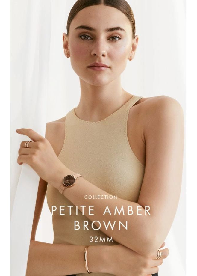 The Petite Amber features a light brown dial with a sunray finish. A vibrant colour associated with warmth, energy, and boldness. Crafted with polished stainless steel, available with a refined rose gold plating. A delicate and chic timepiece that gives your look a unique touch.